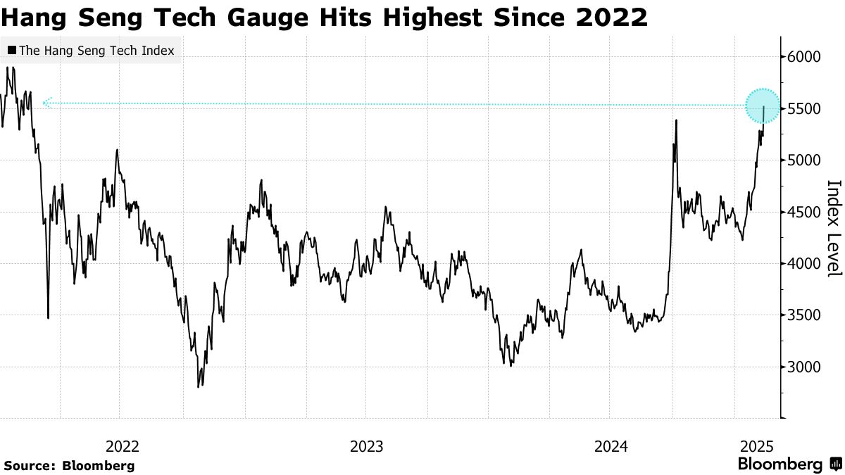 恒生中國企業指數週一延續漲勢,該指數上週五已觸及2022年2月以來最高水平。早盤漲幅一度達1.7%,隨後有所回落。本月早些時候,受中國初創企業深度求索(DeepSeek)被譽為顛覆性突破的AI模型推動,香港科技股指數已進入牛市。