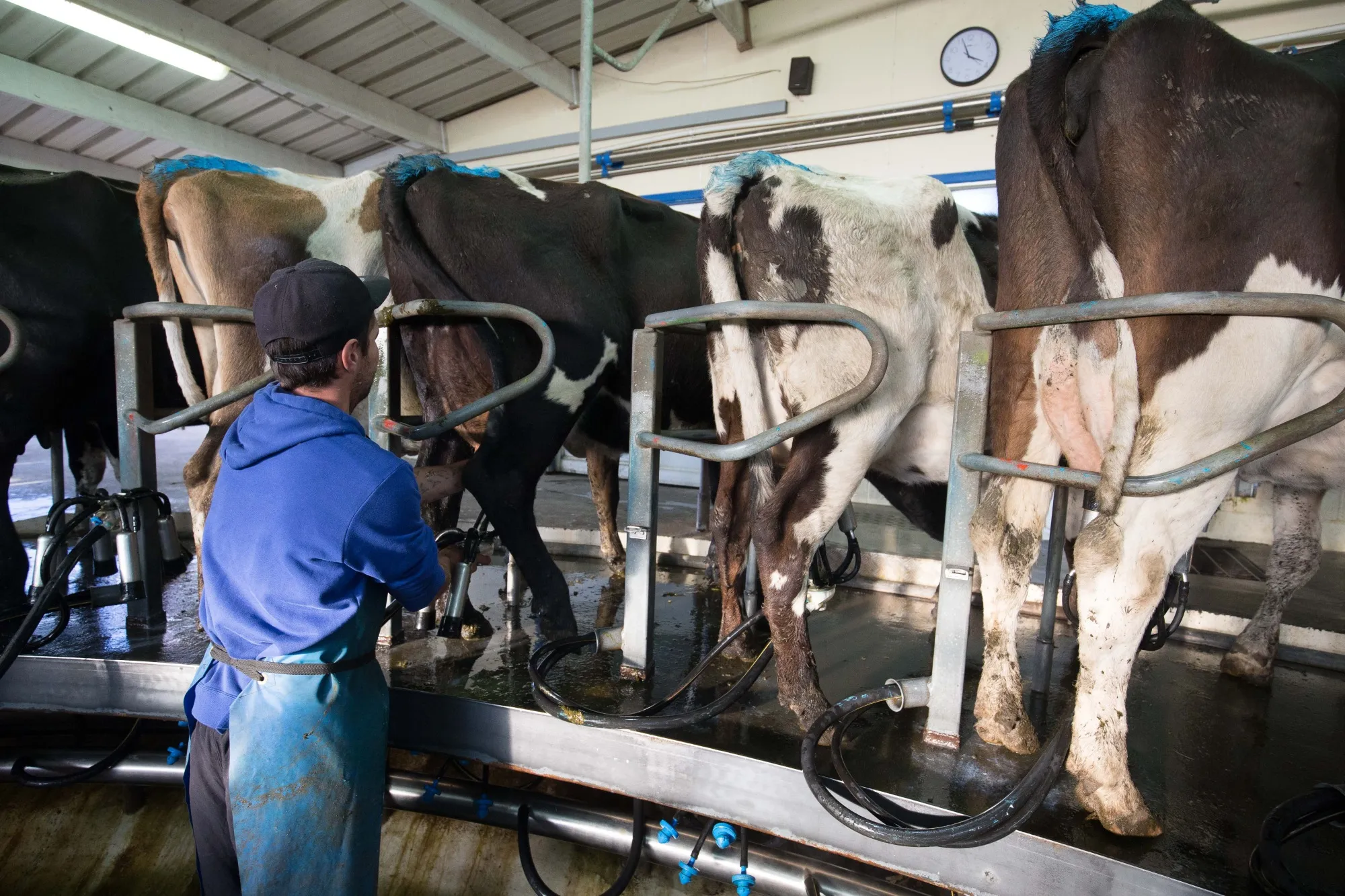 新西蘭哈維拉,一名員工正在為奶牛擠奶做準備。