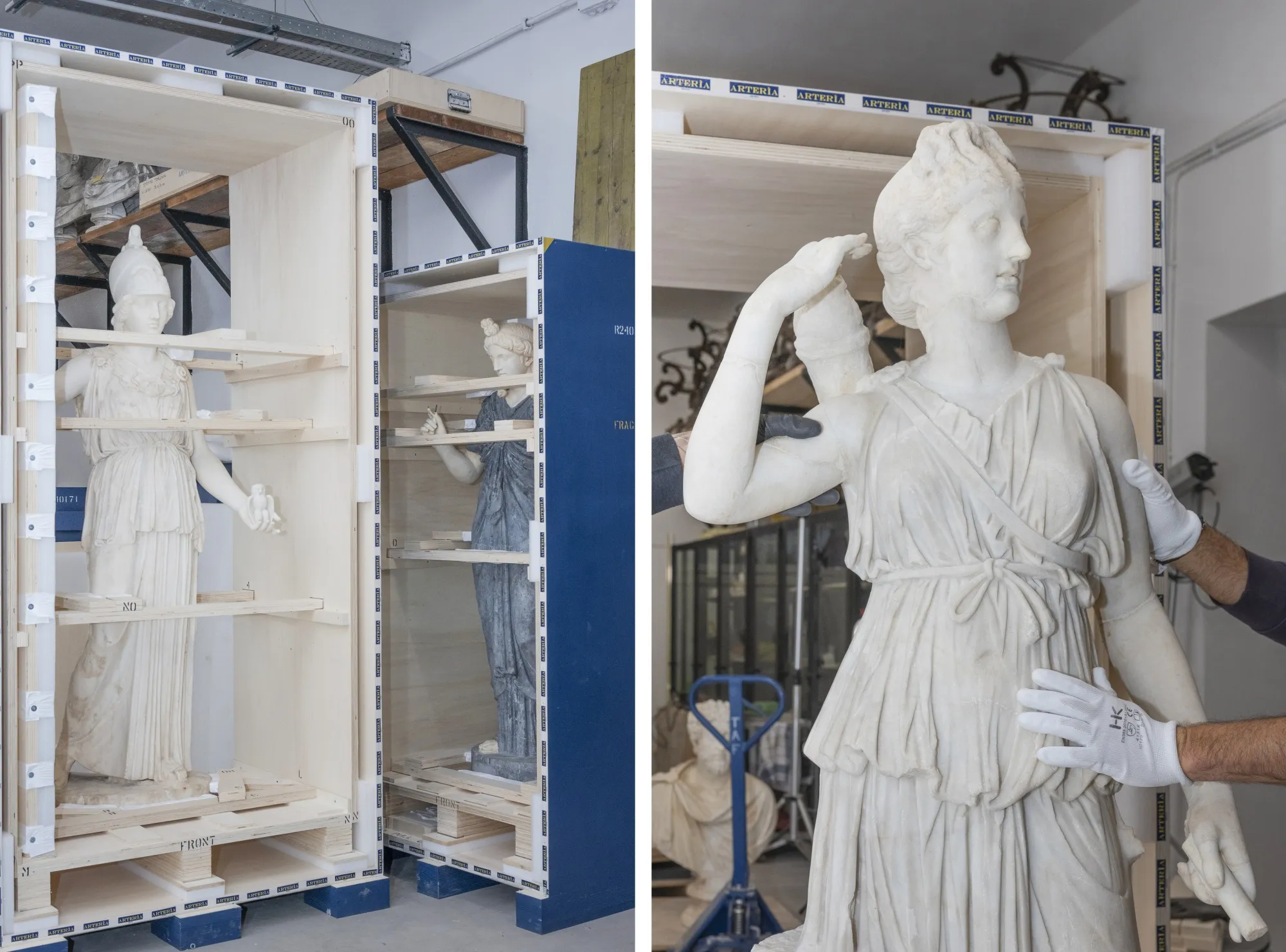 左圖:雅典娜與伊西斯雕像。右圖:修復實驗室中的狄安娜雕像。攝影:費代裏卡·瓦拉布雷加為《彭博商業週刊》拍攝最後進入實際修復階段。這項工作可能需要替換18-19世紀技術人員使用的發黃有毒灰漿;卡拉魯巴團隊採用更安全美觀的新材料替代——既能與大理石融為一體,又不會掩蓋修復痕跡。修復完成後,意大利文化遺產與活動部將對雕像進行驗收;部分雕像會覆蓋防塵塑料膜,看起來就像巨型復活節巧克力。