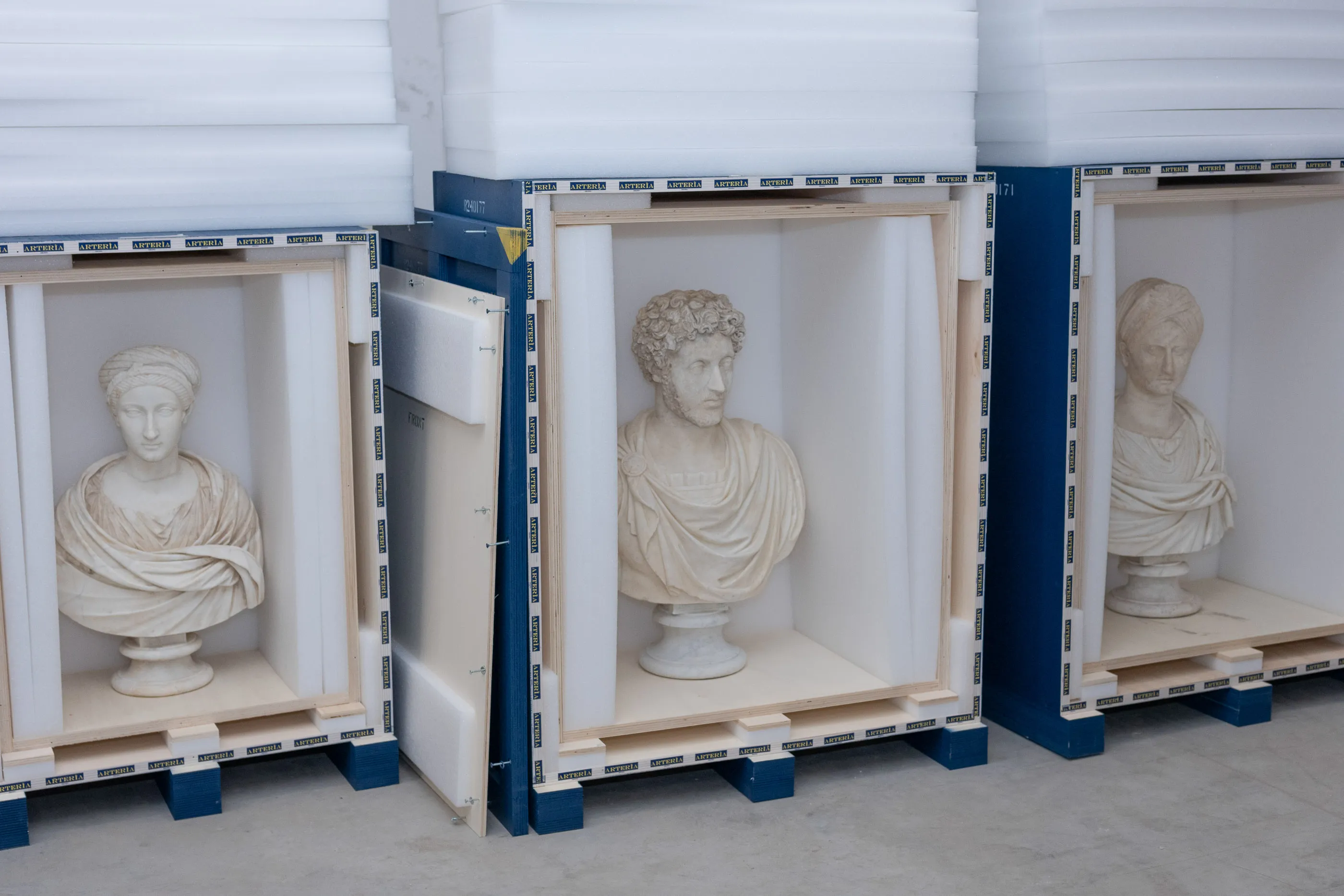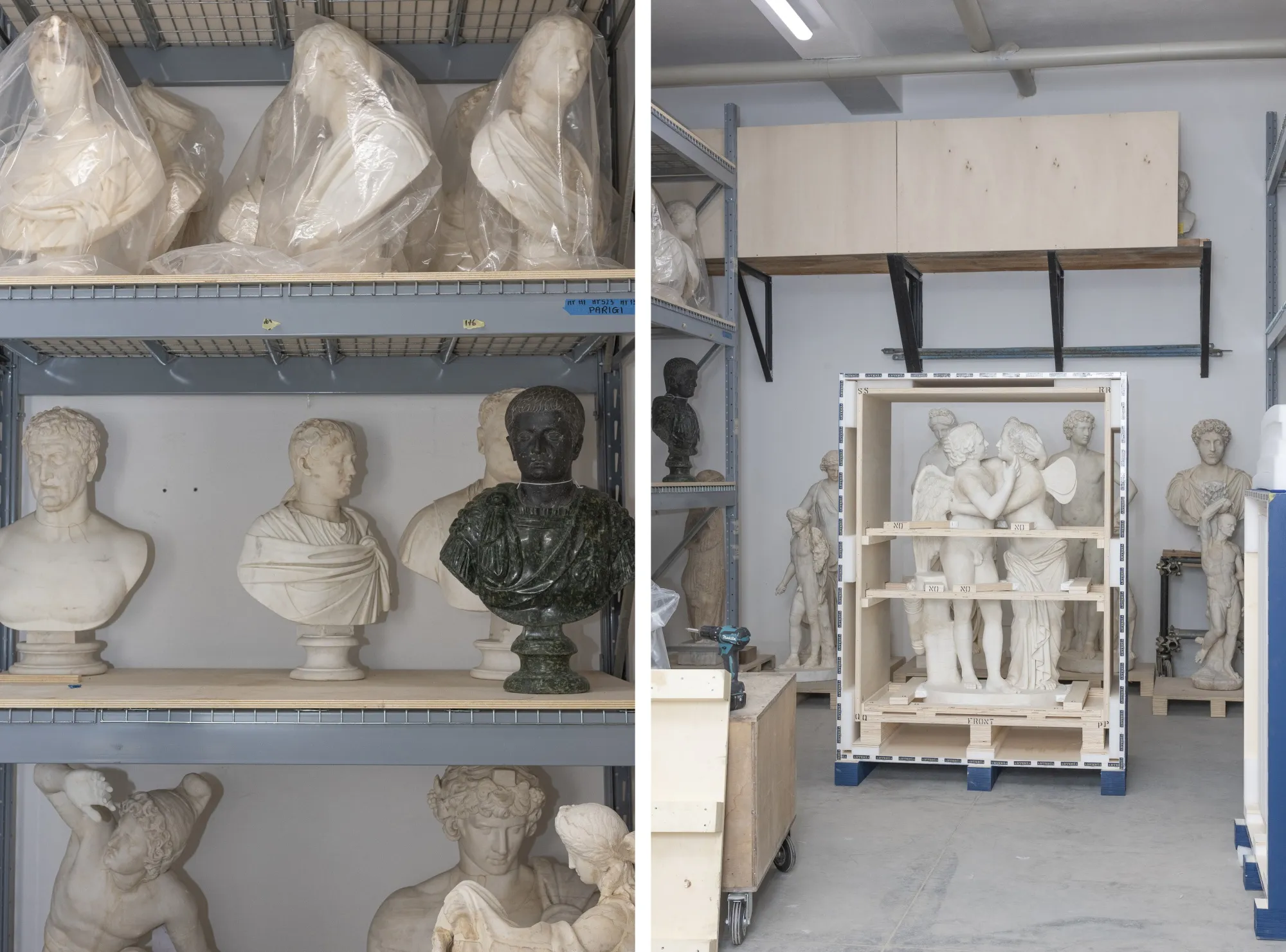 當你踏入藏品實驗室與倉庫時,迎接你的沒有冗長開場白。即使你對古代雕塑一無所知,也很難不為之震撼。一排排直達天花板的架子上,陳列着約2000年前的半身像。某個房間裏,成排的巨型雕像巍然矗立,部分高度超過10英尺。另一間實驗室裏,一尊微微前傾的裸體女性雕像正在修復中,其勻稱大腿的裂縫中隱約可見金屬支架。還有一間最令人歎為觀止的展廳——數十尊雕像各自佇立在基座上,諸神、女神、運動員、動物、帝王與英雄構成視覺的交響。