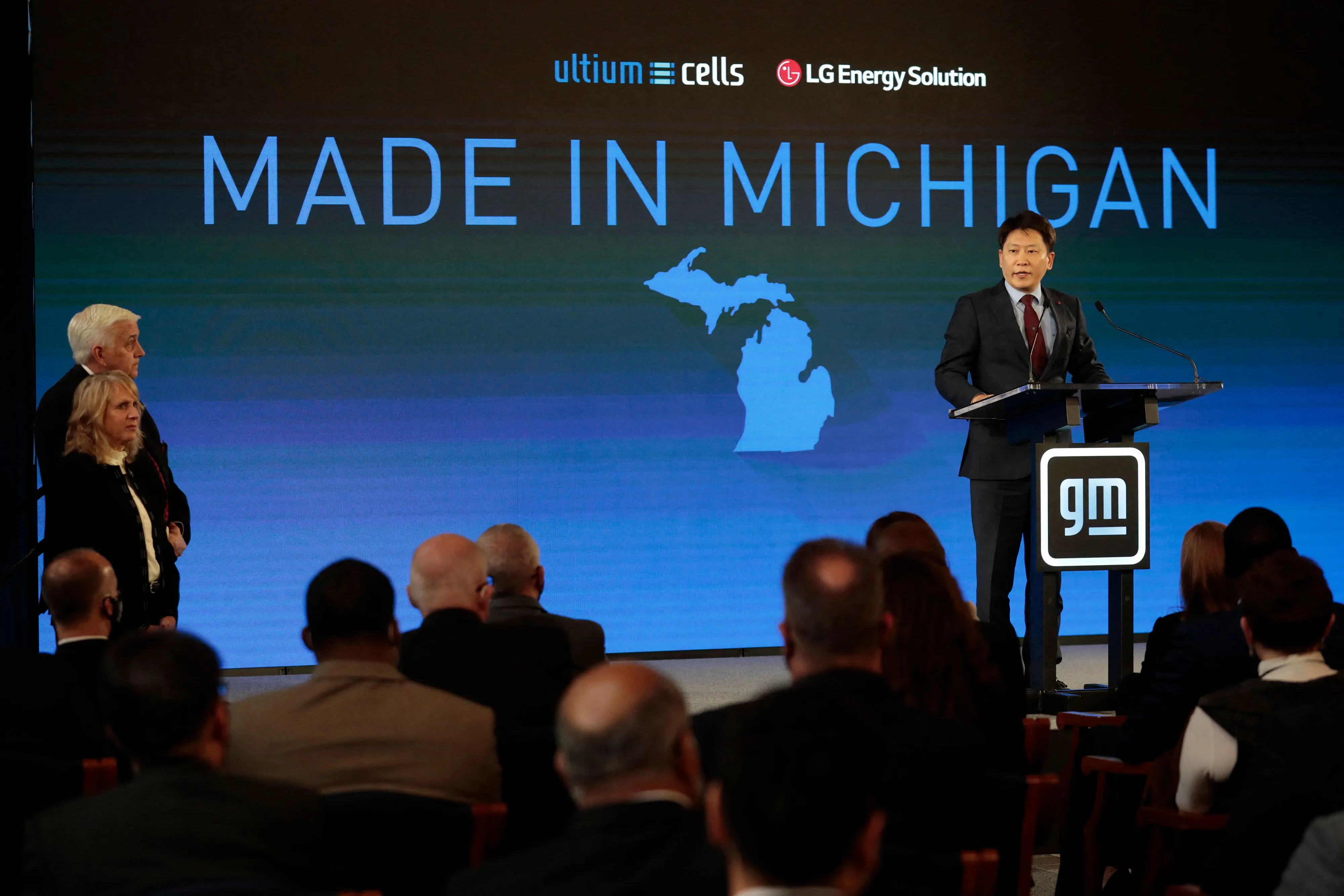 LG新能源先進汽車電池部門負責人David Kim在2022年通用汽車宣佈向密歇根州四家制造工廠投資超70億美元的活動上發言。攝影師:Jeff Kowalsky/AFP/Getty Images閲讀更多:特朗普對電動車的質疑威脅韓國540億美元投資計劃