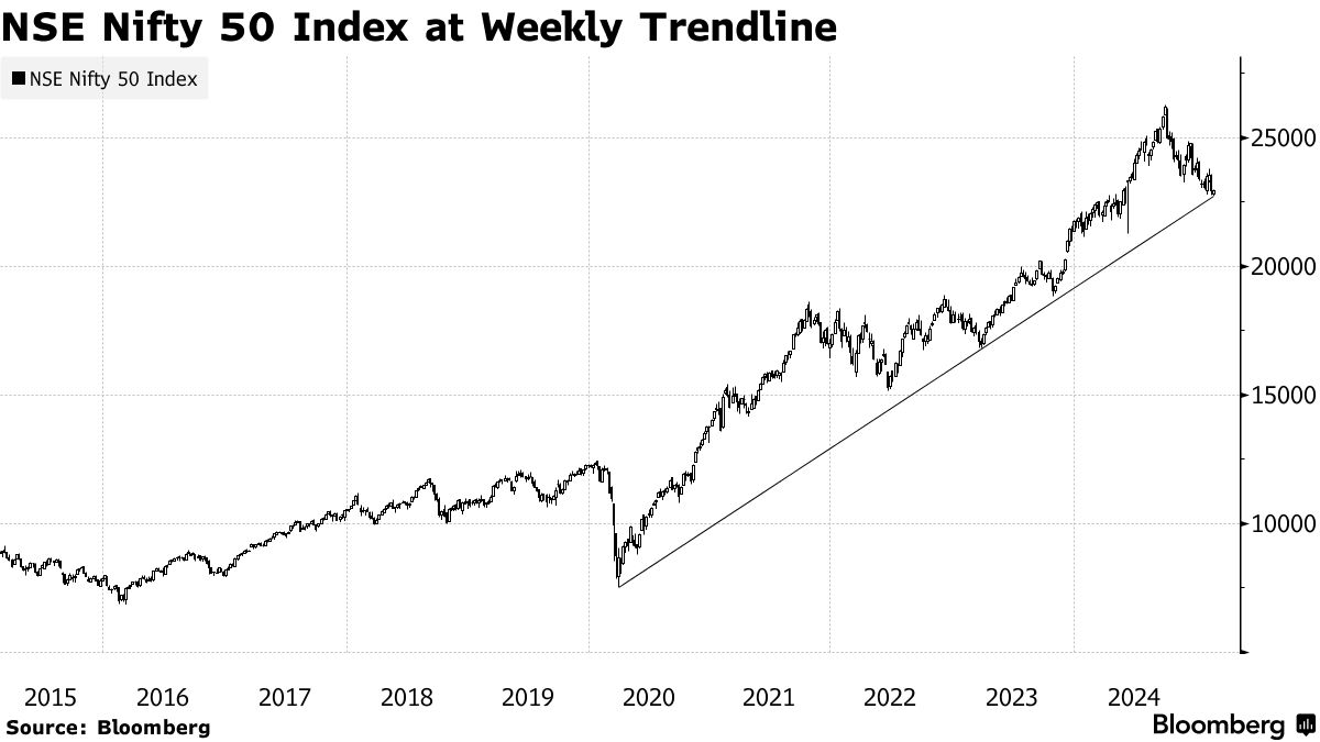 在從9月高點下跌13%後,NSE Nifty 50指數顯示出支撐跡象,尤其是在周線圖上。該指數目前正位於一條從2020年3月低點延伸的關鍵趨勢線上——這一水平曾在2023年3月和10月保持堅挺。雖然這次支撐能否守住尚待觀察,但多頭目前仍有可依賴的依據。