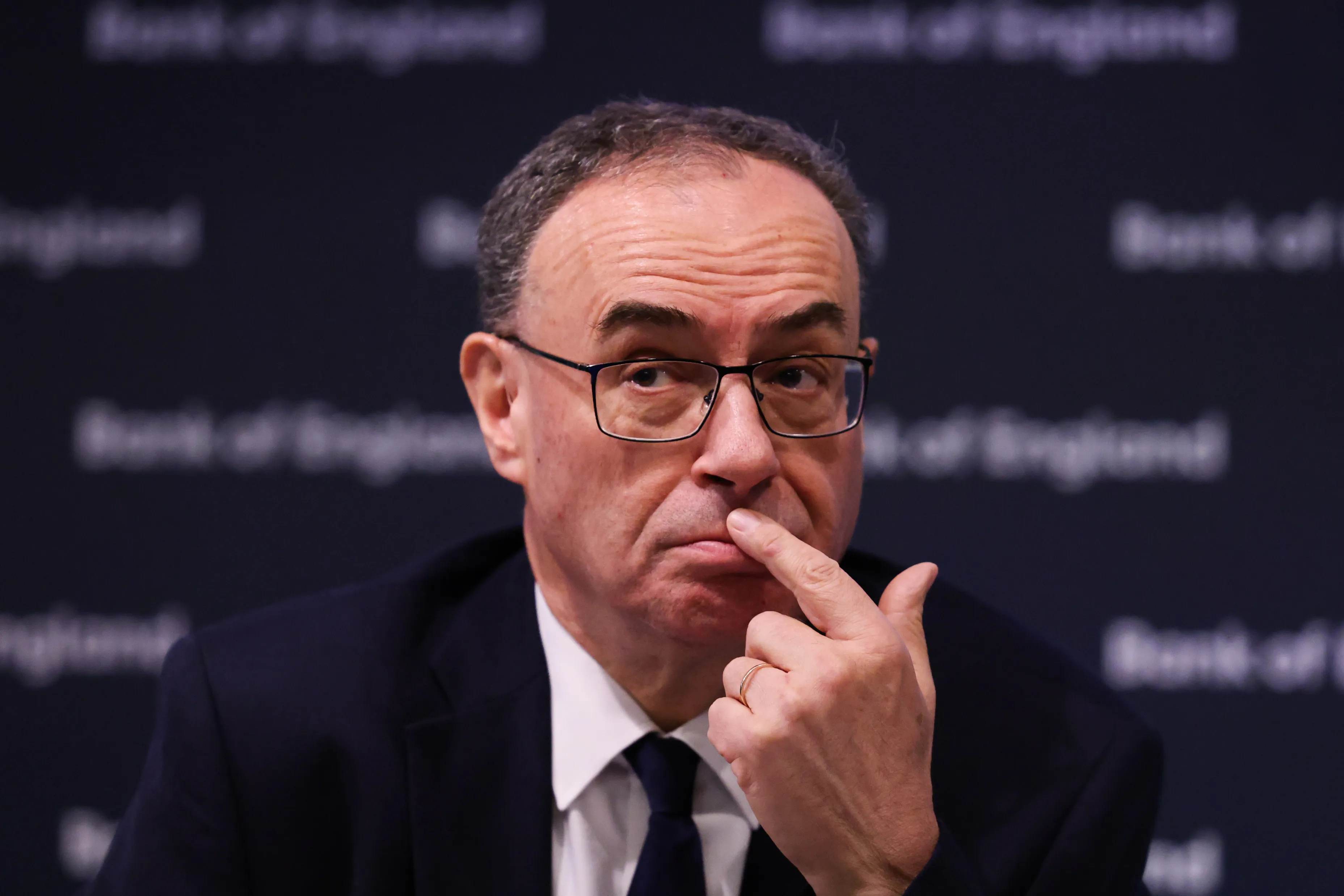 英格蘭銀行行長安德魯·貝利在2025年2月6日星期四的貨幣政策報告新聞發佈會上。