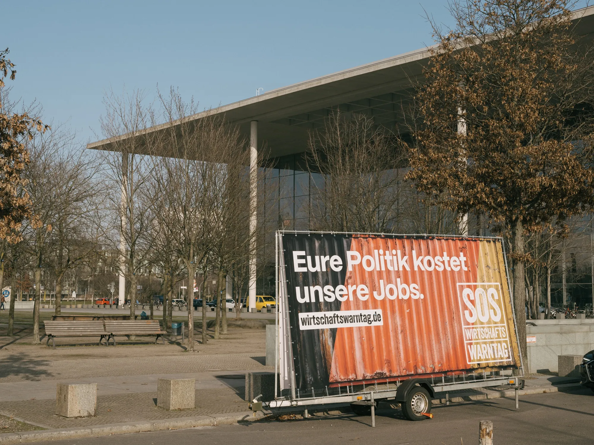 柏林政府區的抗議標語警告政客保護就業崗位攝影師:艾奧娜·杜茨/彭博社在阿富汗尋求庇護者持刀殺人事件後,梅爾茨藉助德國選擇黨的票數強行通過強硬移民決議,無視社民黨與綠黨的反對。相關立法嘗試失敗引發貝爾伯克與保守派同僚的公開衝突,進一步擴大了本應在下屆政府中合作的政黨間裂痕。
