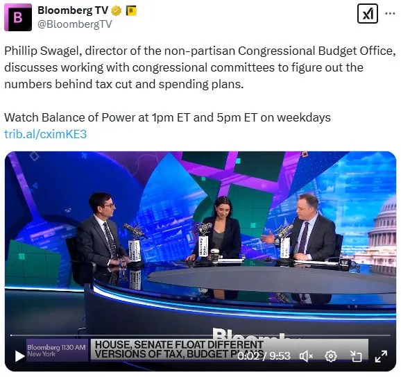 今天下午1點彭博電視台權力平衡早間節目中,主持人喬·馬修與凱莉·萊茵茨採訪了國會預算辦公室主任菲利普·斯瓦格爾,探討該機構將如何評估眾議院和參議院提出的成本削減與税收提案。