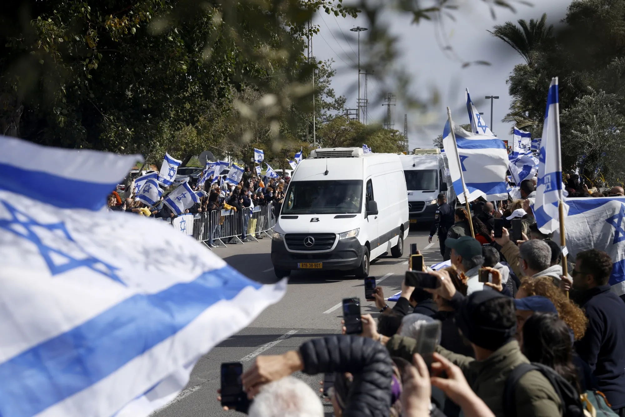 2月20日,以色列特拉維夫,運送四具被釋放人質遺體的車隊抵達法醫鑑定機構時,人們手持旗幟站立。