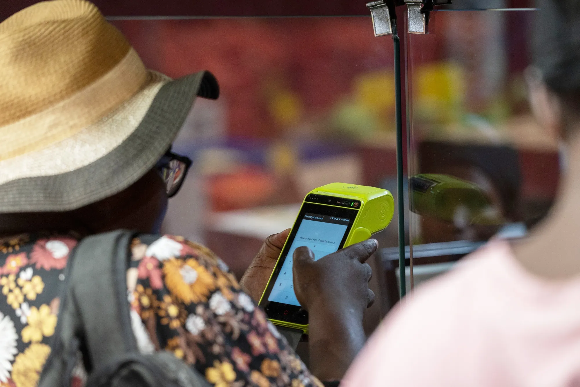 南非約翰內斯堡一家食品批發市場,顧客手持蘭特紙幣。