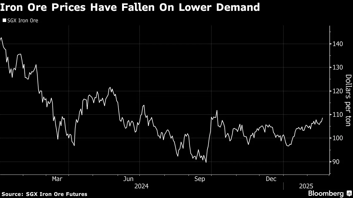 鐵礦石成為2024年表現最差的大宗商品之一,價格跌幅超過四分之一,基準期貨年均價較上年下降約7%。新加坡市場的鐵礦石價格曾攀升至每噸140美元以上的峯值,隨後跌至約100美元/噸。分析師預測到2025年底,價格很可能進一步跌破90美元/噸。