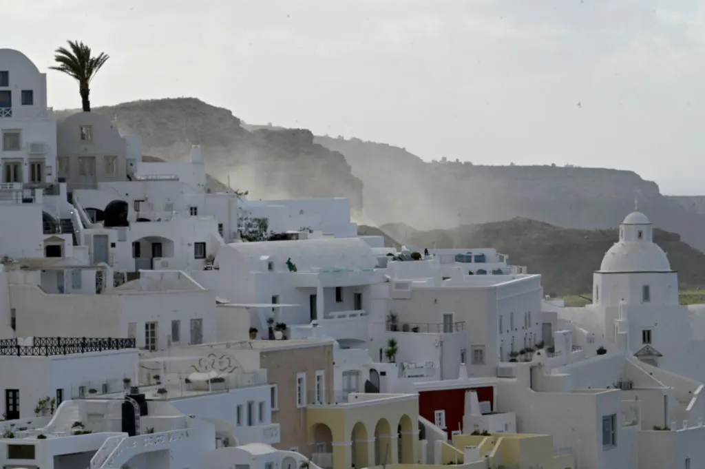 地震引發的山體滑坡揚塵在聖托里尼費拉鎮後方升起。