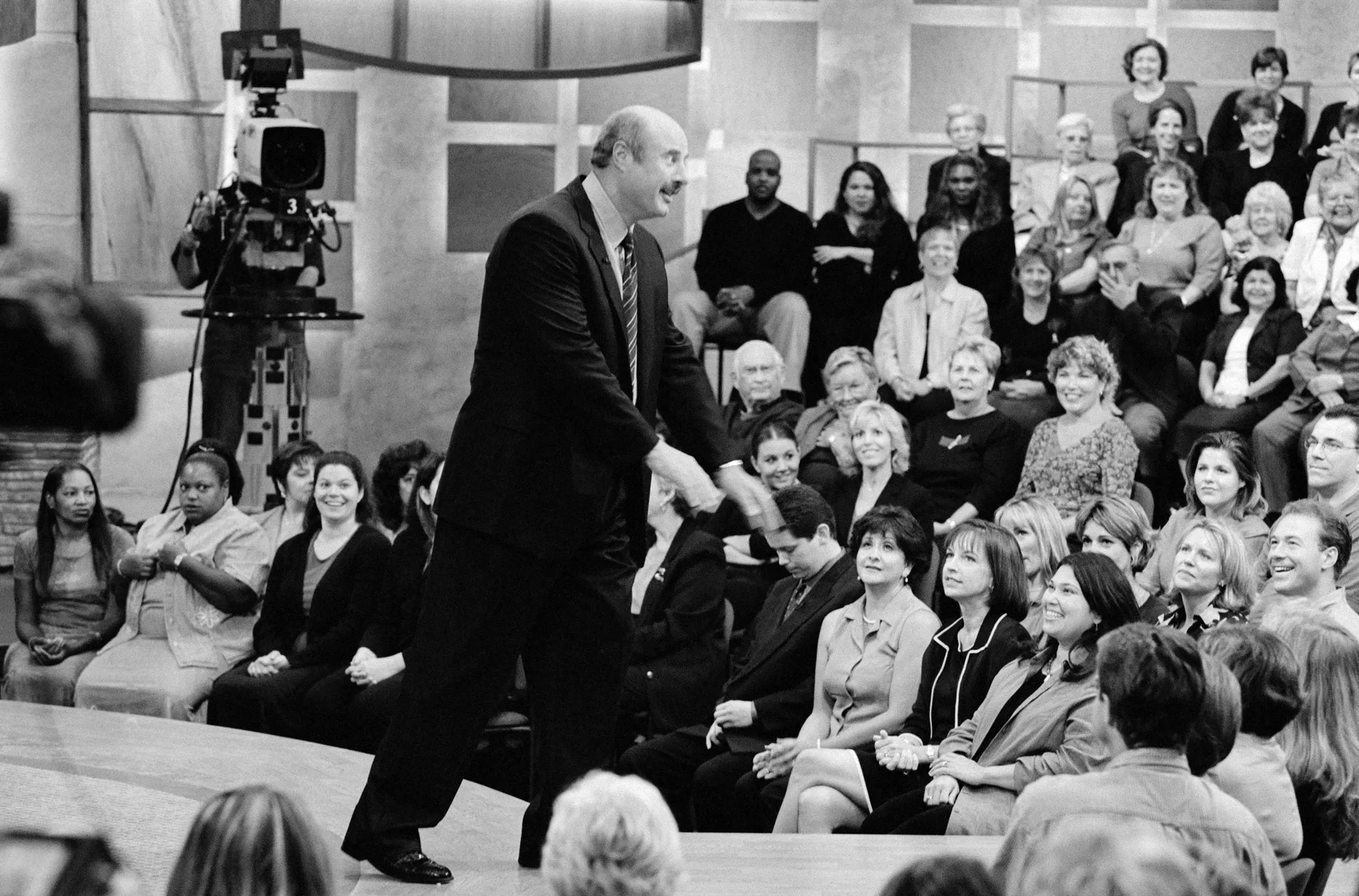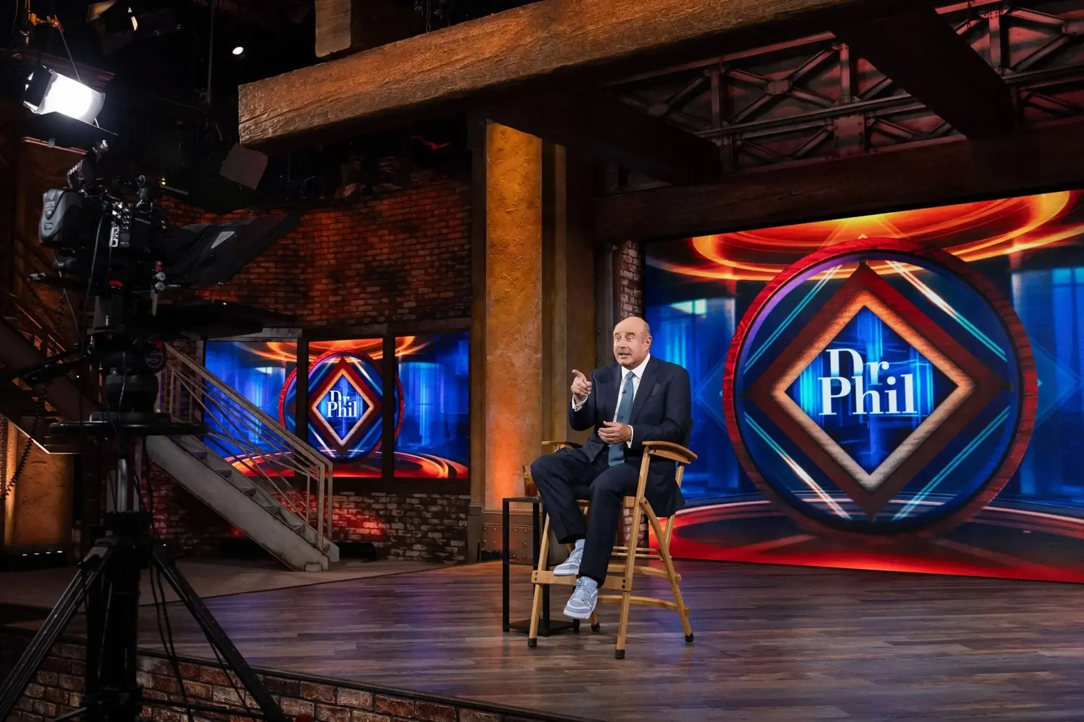 麥格勞迅速成為頻道門面,在其新節目*《菲爾博士黃金時段》*中擔任主角——這檔重啓節目更注重新聞性,並採用更炫的演播室設計。黃金時段摒棄了原版節目的暖光色調和軟墊扶手椅,採用多屏幕高科技佈景、大膽的藍色系,有時還會出現更適合遊戲節目的銀色講台。