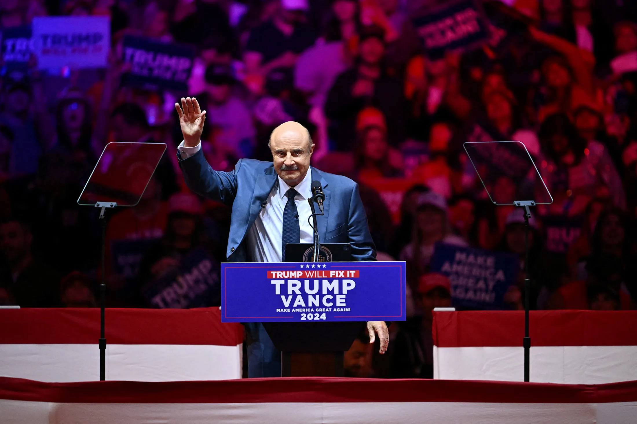菲爾·麥格勞緩步走上舞台,向歡呼的人羣揮手致意。十月底的這場活動中,這位以"菲爾博士"聞名的前日間電視明星身着低調的藍色西裝與領帶亮相紐約麥迪遜廣場花園,為特朗普激昂的競選集會站台,精心修剪的濃密鬍鬚顯得格外莊重。