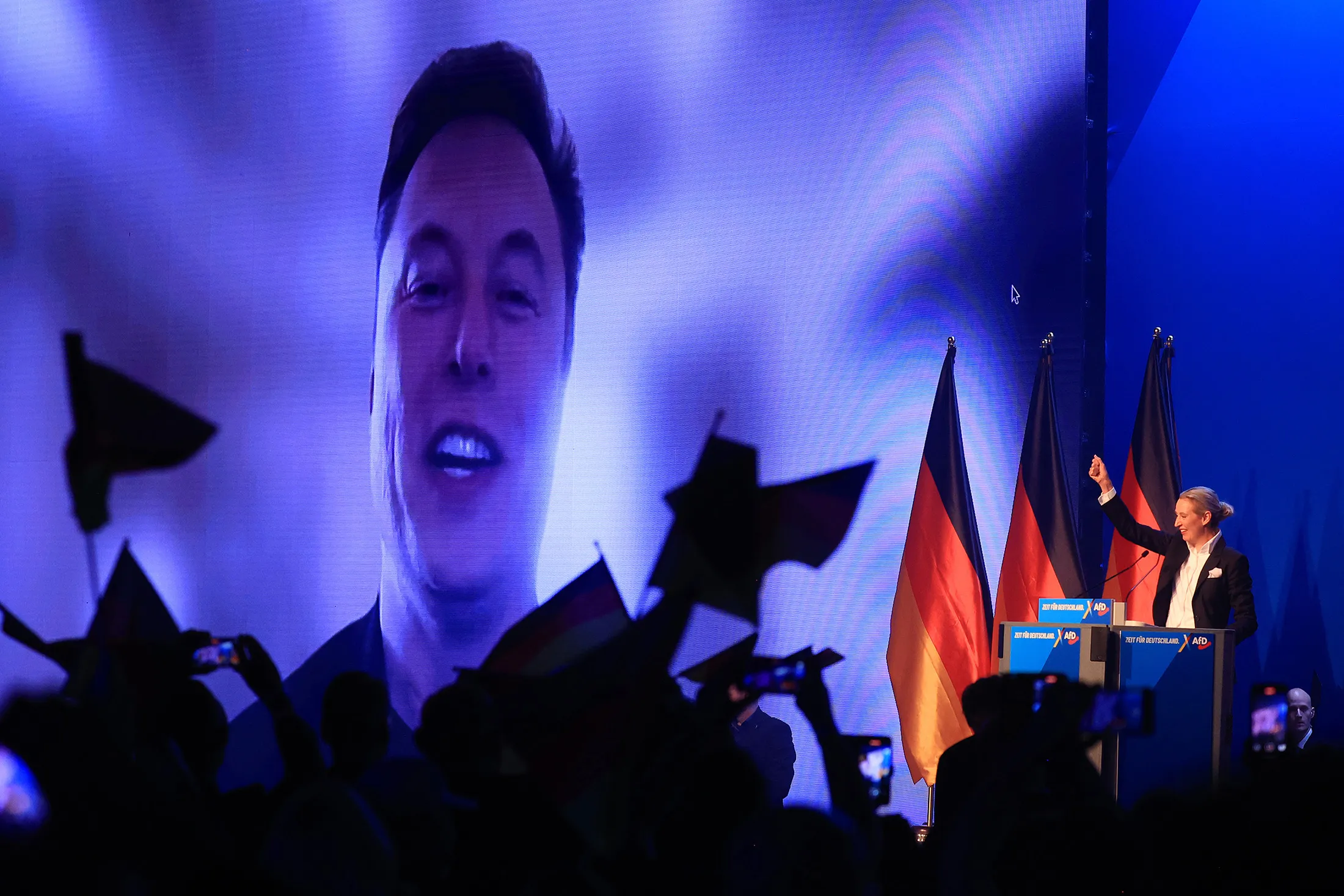埃隆·馬斯克與德國選擇黨聯合主席愛麗絲·魏德爾進行視頻會晤。攝影師:克里斯蒂安·博克西/彭博社隨着基民盟向左傾斜,不滿的選民轉向相反方向,2013年德國選擇黨以反歐盟主張崛起。這個極右翼政黨(近期受到埃隆·馬斯克和美國副總統JD·萬斯公開支持)在2015年移民潮後愈發反移民,很快轉向帶有納粹色彩的口號。2017年該黨成為二戰後首個進入聯邦議院的極右團體,在前共產主義東德地區支持率尤其強勁。疫情期間選擇黨持反疫苗立場,2021年獲得10.3%選票。其當前政綱主張大規模驅逐移民,並強調所謂"德國傳統價值觀"。