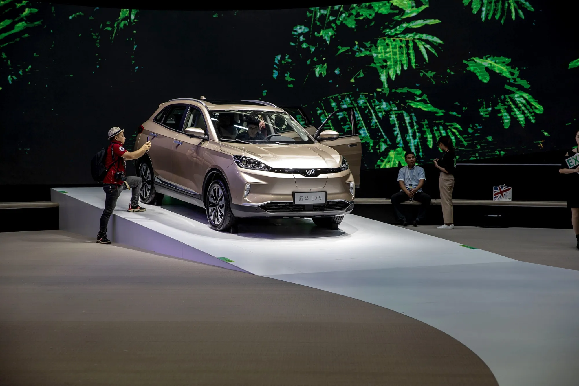 威馬EX5純電動車亮相2018廣州車展。攝影師:沈起來/彭博社多年慷慨補貼曾推動中國電動車市場瘋狂增長,數百家初創企業攜尖端科技車型湧入市場。但隨着政府開始遏制過剩產能,客户爭奪戰愈演愈烈,幾輪大幅降價讓比亞迪等行業巨頭佔據更大優勢,小企業則在生存線上掙扎。