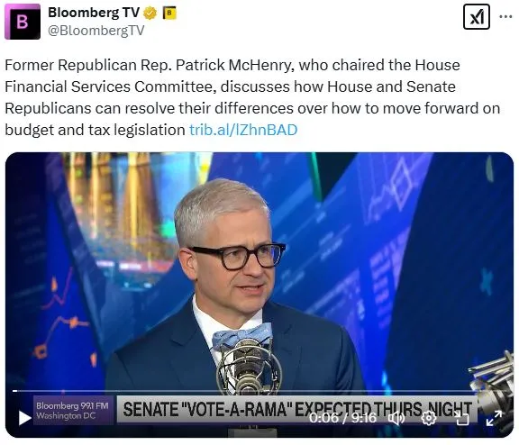 今天下午1點彭博電視台《權力平衡》早間節目中,主持人喬·馬修和凱莉·萊因茨採訪了前共和黨眾議員帕特里克·麥克亨利(曾任眾議院金融服務委員會主席),探討國會共和黨人在推進大規模預算和税收法案時,眾議院與參議院之間的分歧。
