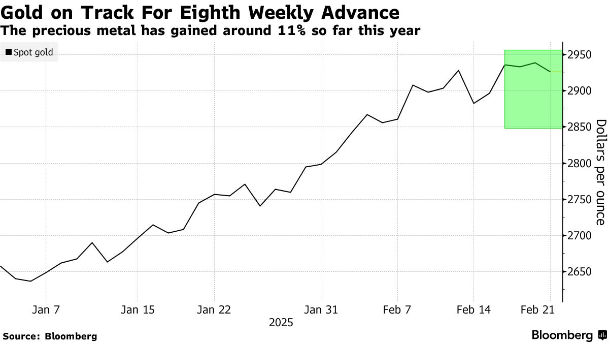 週五金價微跌至每盎司2,926美元左右,但本週仍保持1%以上的漲幅,黃金支持交易所交易基金的持倉量快速上升成為市場特徵。若實現八週上漲,這將是2020年以來最長的連漲紀錄。