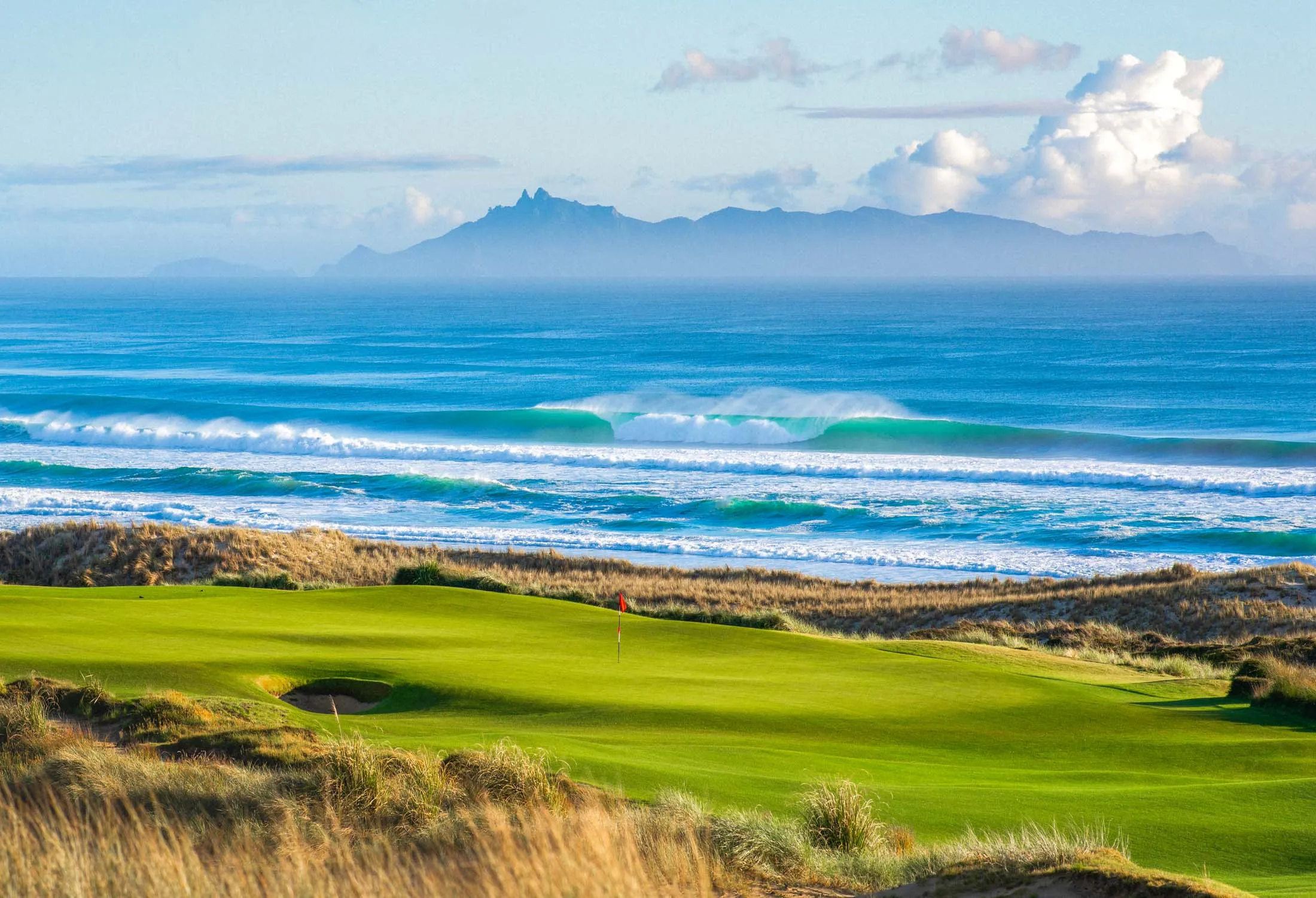 備受追捧的設計師比爾·科爾與本·克倫肖打造的南場16個球洞均享有海景,寬闊起伏的球道與果嶺地形相得益彰。湯姆·多克設計的北場球道寬度相近,但地形更為大膽,遍佈明顯的圓丘、隆起和起伏。更大的內陸沙丘地貌在推杆區得到呼應,形成更富動感與張力的輪廓。