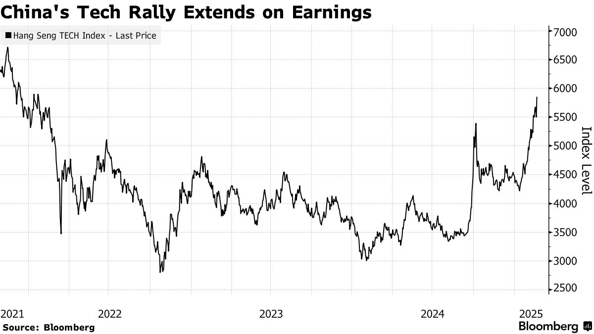 “中國科技股仍具備巨大增長潛力,恒生科技指數甚至有望在短期內實現與納斯達克類似的漲幅,”深圳龍輝基金管理有限公司創始人兼投資總監周楠表示。“投資者樂觀情緒源於深度求索的AI模型、科技公司堅實的業務基礎,以及特朗普對美聯盟採取強硬立場後中國地緣政治環境的變化。”