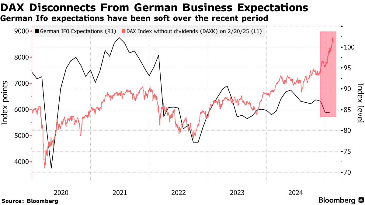 德國基準DAX指數部分受到保守派領先候選人弗里德里希·梅爾茨有望與社會民主黨甚至綠黨結盟的預期支撐,此舉可能確保議會中獲得穩固的多數席位。這被視為推動急需的經濟改革和可能放寬嚴格借貸規則(即所謂的債務剎車)的關鍵。