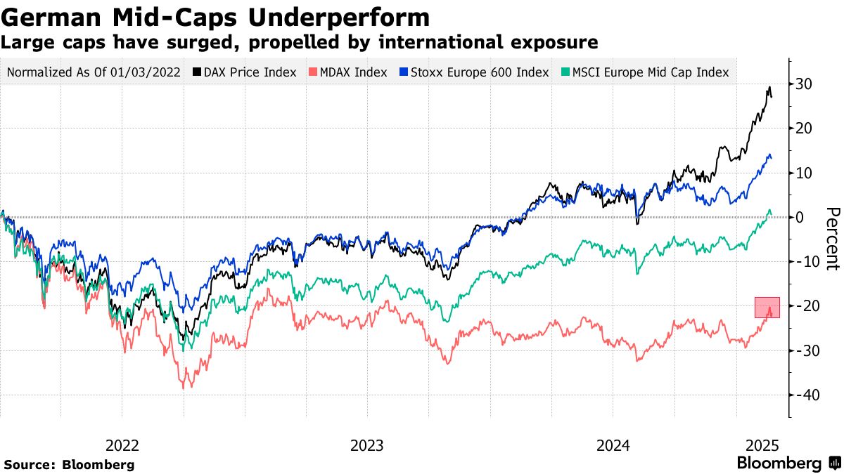 DAX指數“需要選舉帶來的盈利支持,例如有利於商業的政策和更高的財政支出,以繼續跑贏較小的MDAX指數,”彭博行業研究策略師洛朗·杜耶和孟凱迪表示,並補充説MDAX“可能因對國內和歐盟經濟更高的敞口以及危機以來最低的估值溢價而處於更有利的位置。”