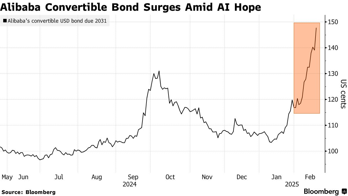 阿里巴巴的可轉換債券表現優異,2025年到期債券漲幅達38%,領跑同行——彭博社