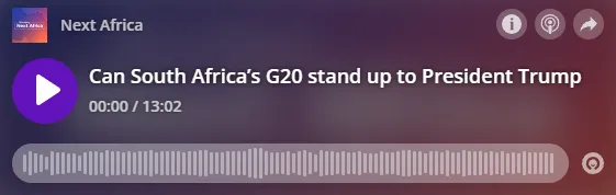 資深記者安東尼·斯誇津與詹妮弗·扎巴薩賈共同探討南非和G20面臨的關鍵問題,以及如果美國從非洲撤出,中國和歐盟等其他參與者將扮演什麼角色。### 新聞綜述