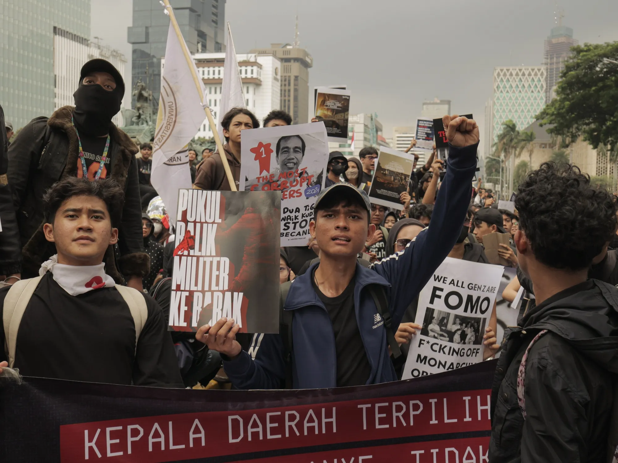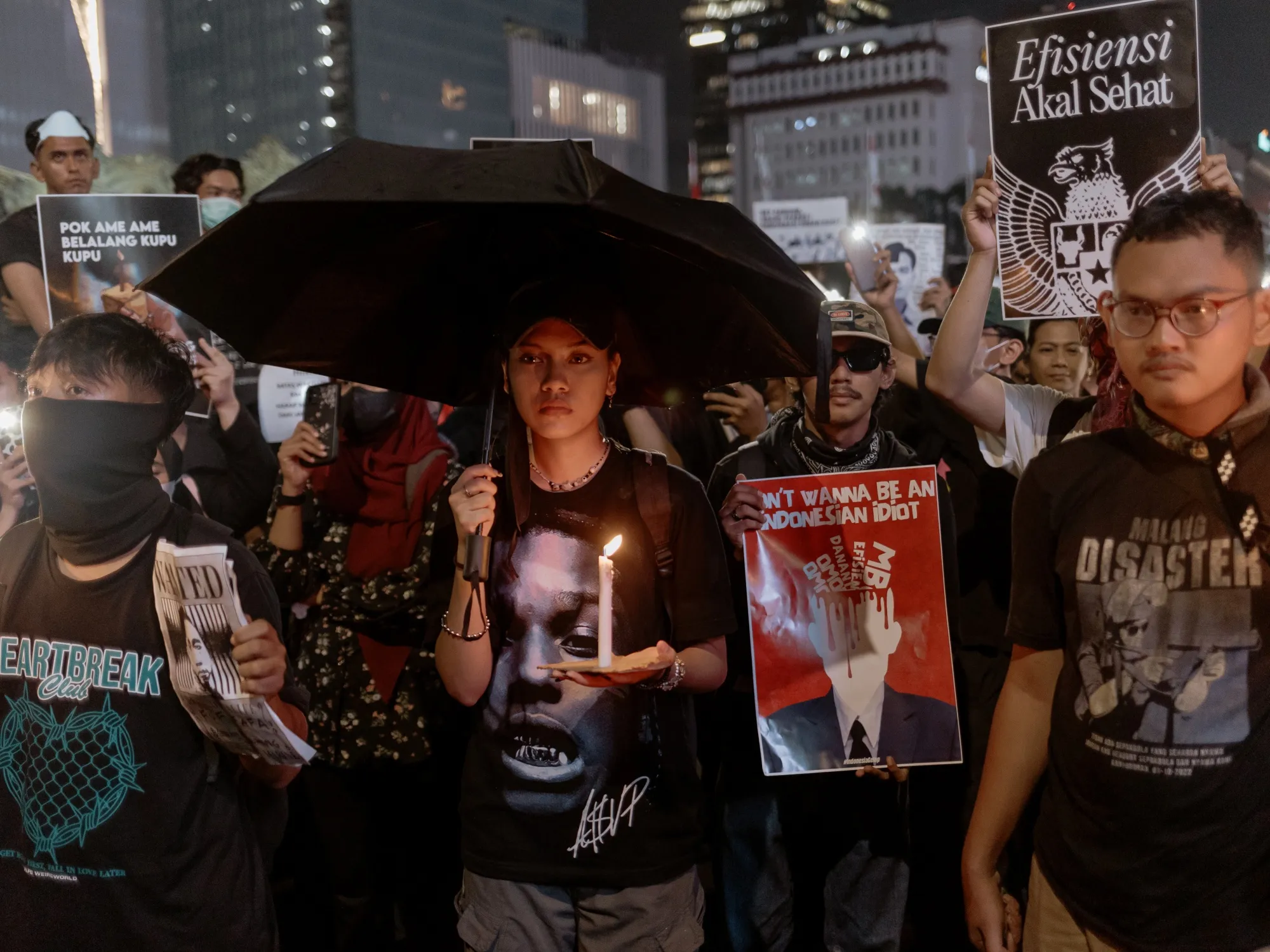 2月21日,抗議者在雅加達舉行反對普拉博沃·蘇比安託的示威活動。攝影師:Muhammad Fadli/彭博社普拉博沃仍以超過80%的支持率保持極高人氣,這得益於免費校餐和健康檢查計劃,以及他在最後一刻撤銷增税等決策。