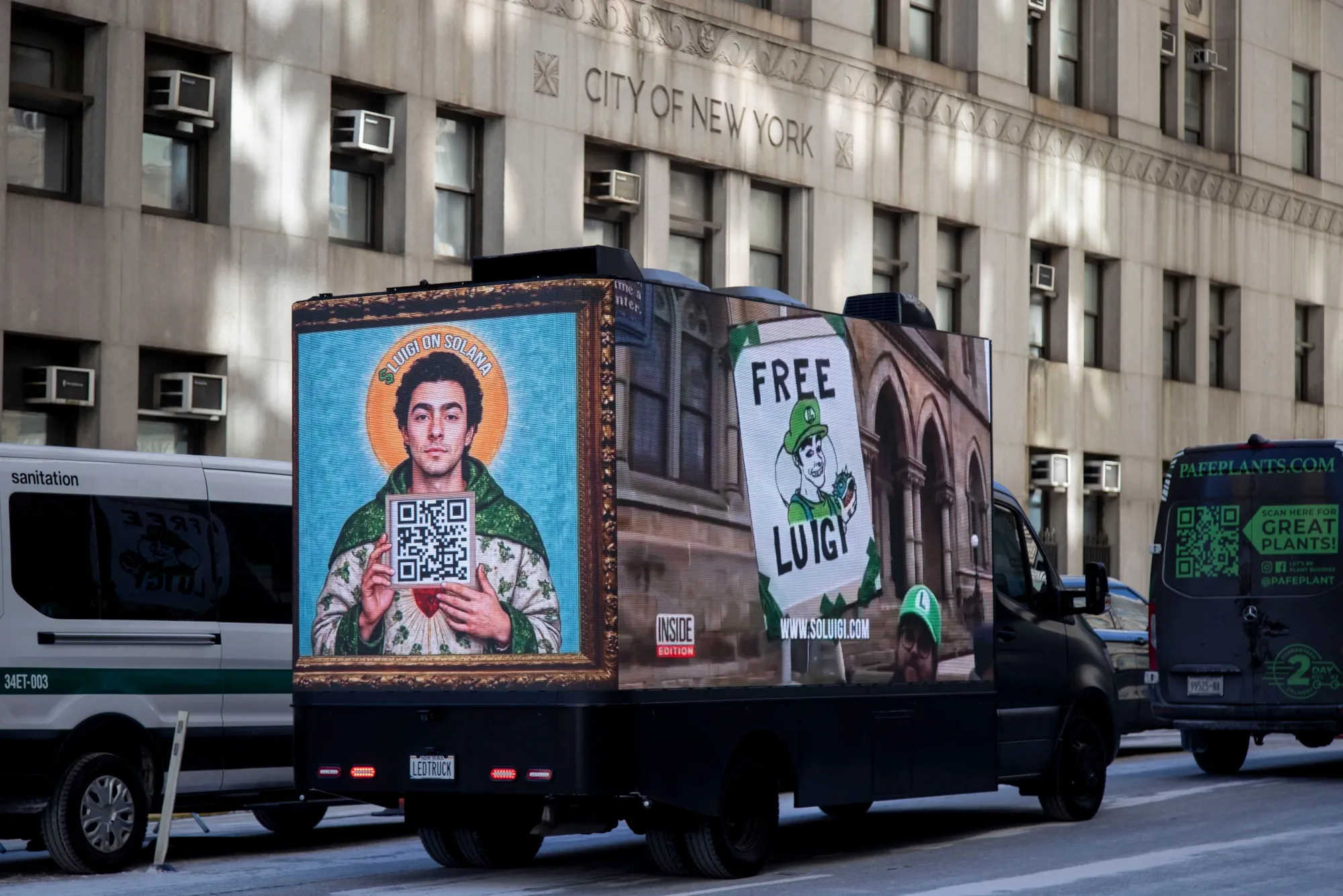 2月21日紐約州最高法院審前聽證會現場,一輛汽車展示着"釋放路易吉"的標語。攝影師:邁克爾·內格爾/彭博社辯護律師弗裏德曼·阿尼菲洛同時抱怨稱,紐約市長埃裏克·亞當斯和警方高層在HBO紀錄片中引用了她尚未獲知的證據材料,包括由演員朗讀被警方稱為曼吉奧尼"宣言"的日記內容。她誓言將質疑這些證據系當局非法扣押所得,並指出相關言論損害了當事人權益。