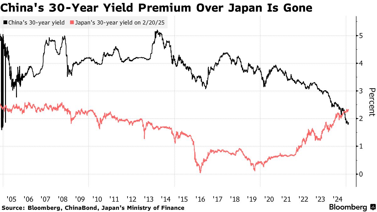這類押注在2024年可能已經獲得回報,因為中國30年期國債收益率降至約二十年來首次低於日本同期國債。儘管由於中國央行推遲降息以及科技股引領的股市反彈,中國國債收益率近幾周有所上升,但30年期收益率仍比日本低約50個基點。