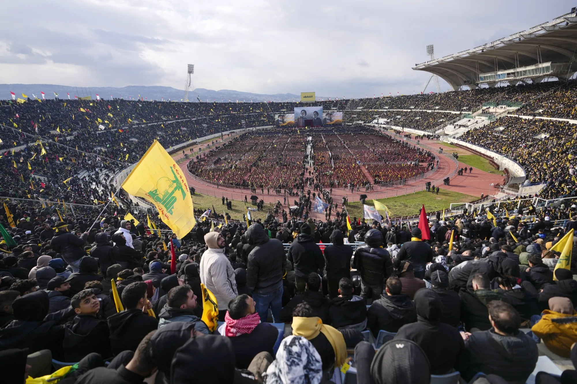 2月23日,民眾聚集在貝魯特體育城體育場參加哈桑·納斯魯拉和哈希姆·薩菲丁的葬禮儀式。
