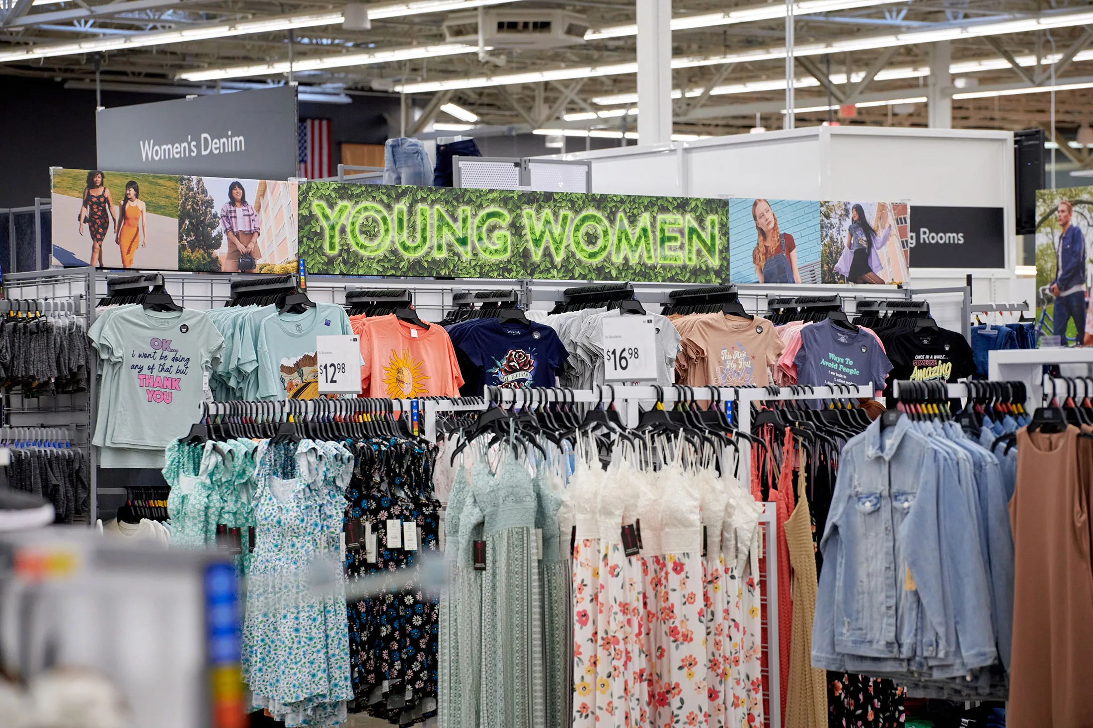 新澤西州西考克斯的一家門店展示着沃爾瑪日益時尚的服裝。攝影師:Gabby Jones/彭博社如今這家零售商再次瞄準高端消費羣體,沿用相似策略。除新一輪門店改造外,沃爾瑪過去幾年全力打造了兩個由新任創意總監Maxwell指導設計的時尚平價服裝系列。在九月的紐約時裝週期間,《天橋驕子》評委Nina Garcia和女説唱歌手Doechii等名人從曼哈頓肉庫區的SUV下車,出席沃爾瑪贊助的Maxwell春季時裝秀。當模特們身着絕非日常低價款的連衣裙和褲裝亮相後,賓客們被引導至相鄰的快閃店,一邊啜飲龍舌蘭酒,一邊翻閲Maxwell為沃爾瑪Free Assembly和Scoop品牌設計的服裝。