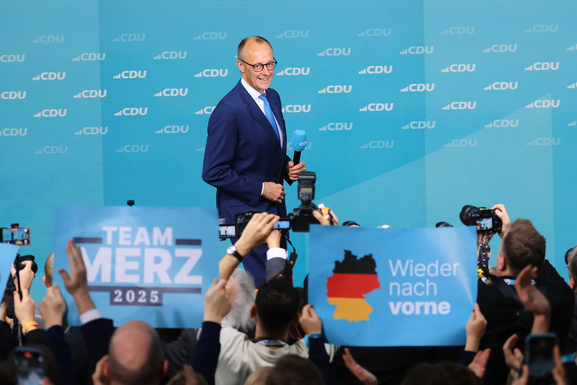 弗里德里希·梅爾茨出席基民盟在柏林舉行的選舉之夜活動。攝影師:克里斯蒂安·博奇/彭博社"合理且及時地組建德國政府是唯一明智的選擇,“梅爾茨在週日晚上的辯論中表示,並補充説他希望在未來兩個月內組建聯合政府。“世界不會等待我們——歐洲正在等待德國,期待我們再次發揮更強的領導作用。”