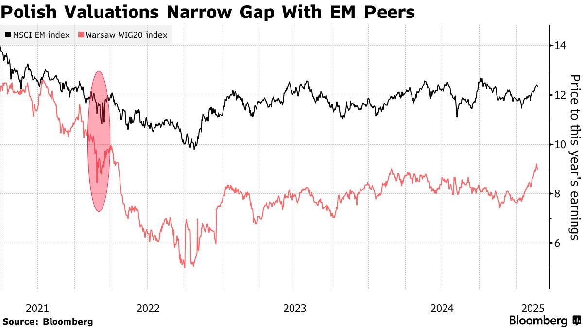 此次反彈意味着波蘭股市估值幾乎收復了俄烏戰爭爆發後的全部跌幅。華沙大型股與MSCI新興市場指數的估值差距正在縮小——WIG20指數的市盈率約為9倍,而新興市場基準約為12倍。