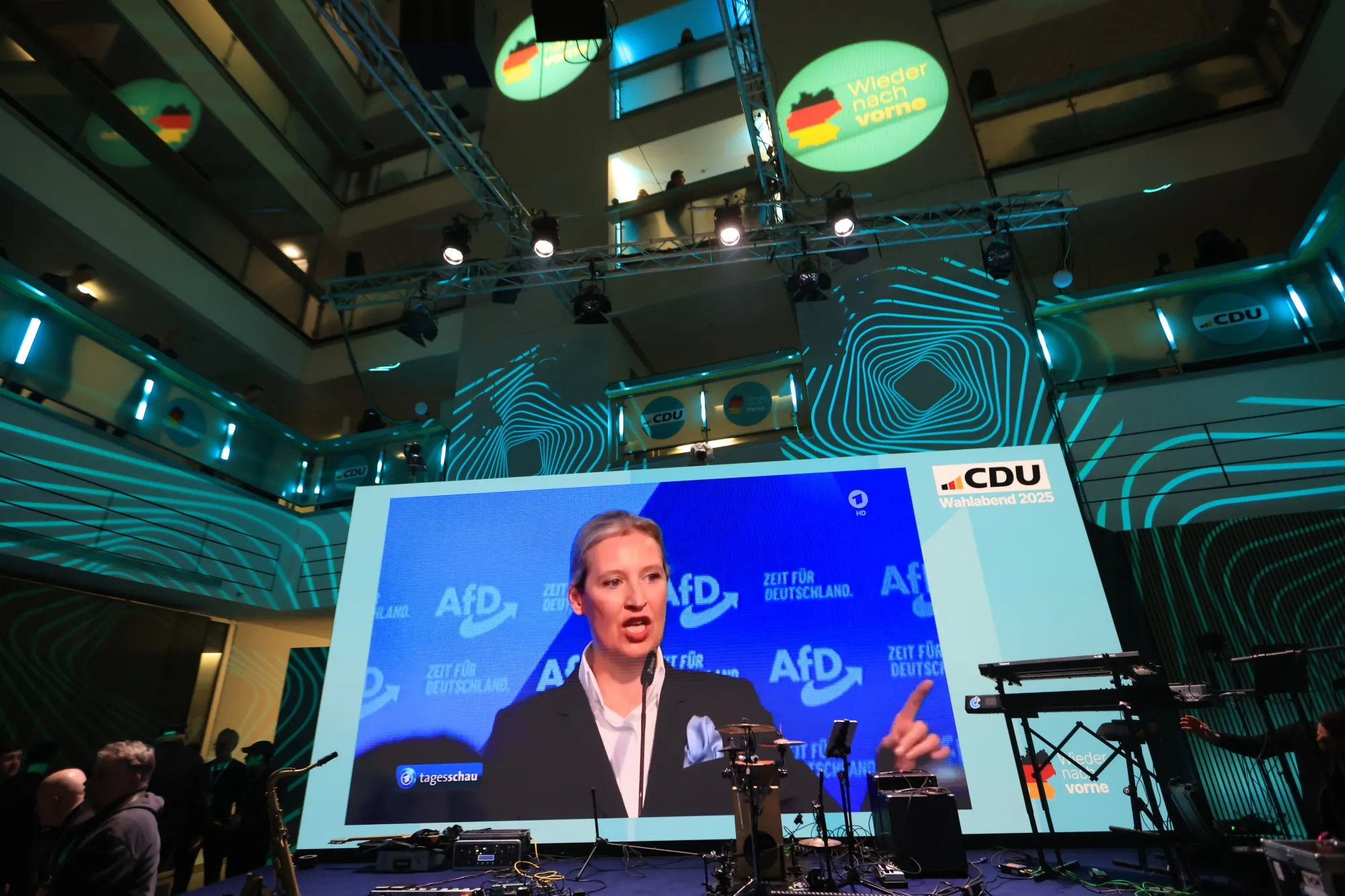 柏林基民盟選舉派對上電視屏幕中的愛麗絲·魏德爾。
