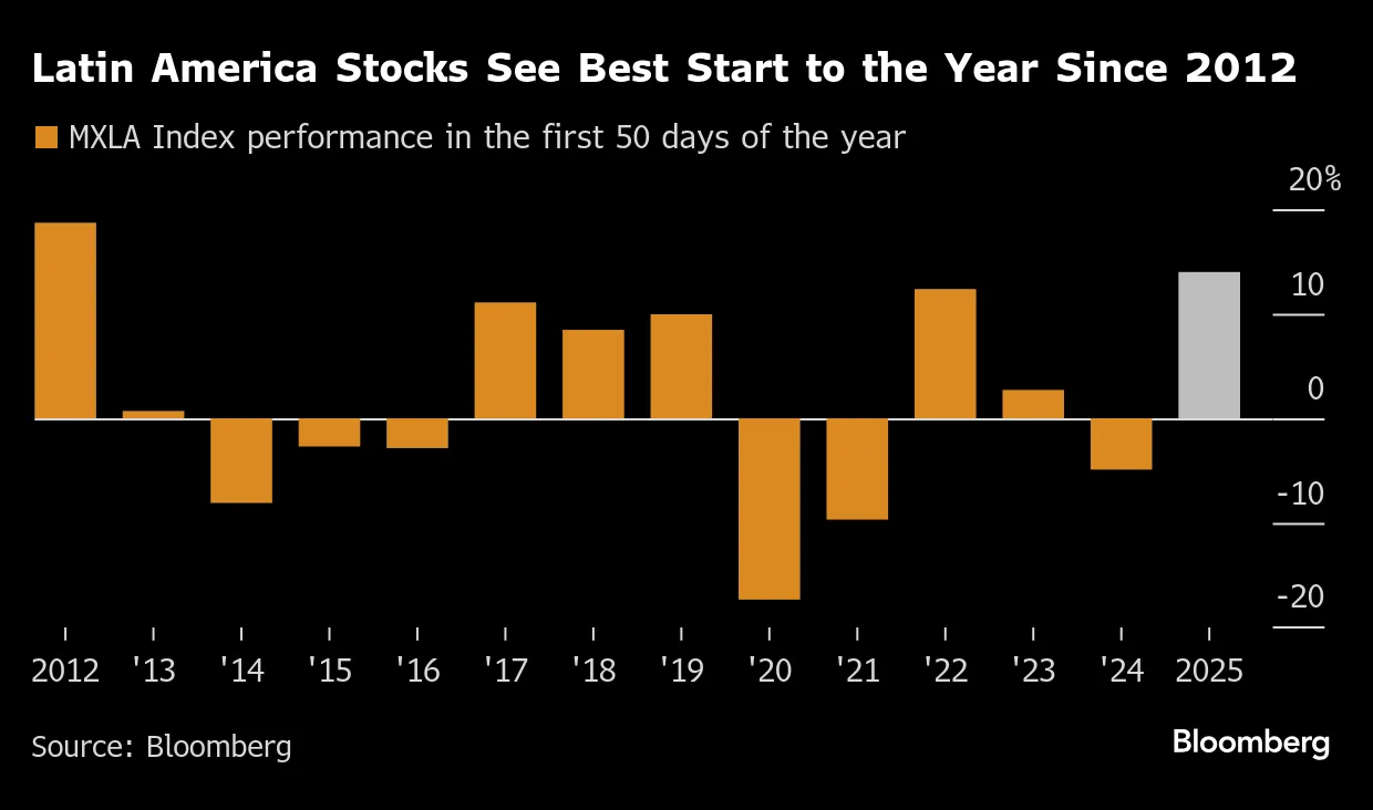 彭博彙編數據顯示,2月14日外國投資者向巴西股市注入14億雷亞爾,當日民調顯示盧拉支持率跌至歷史新低。在哥倫比亞,市場認為古斯塔沃·佩特羅總統管理不善將促使下屆選舉由更保守、親商候選人勝出,這推動了全球最強勁的股市上漲行情。