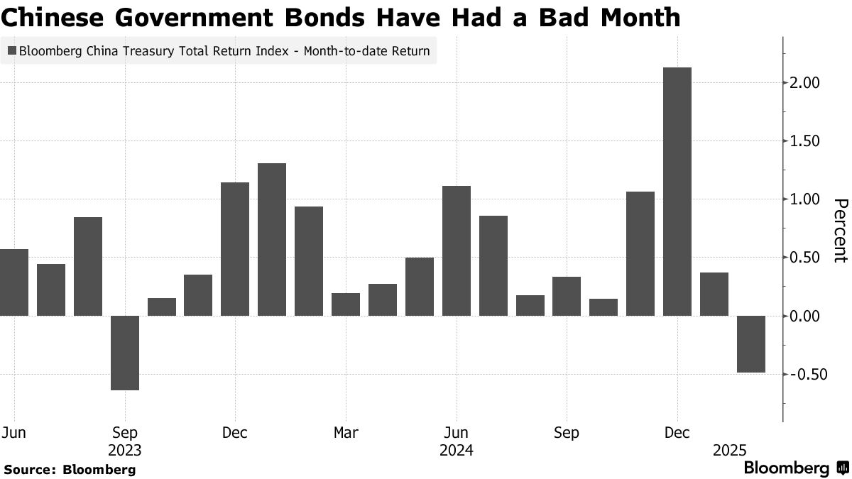 彭博追蹤中國國債表現的指數即將創下2023年9月以來首次月度下跌。