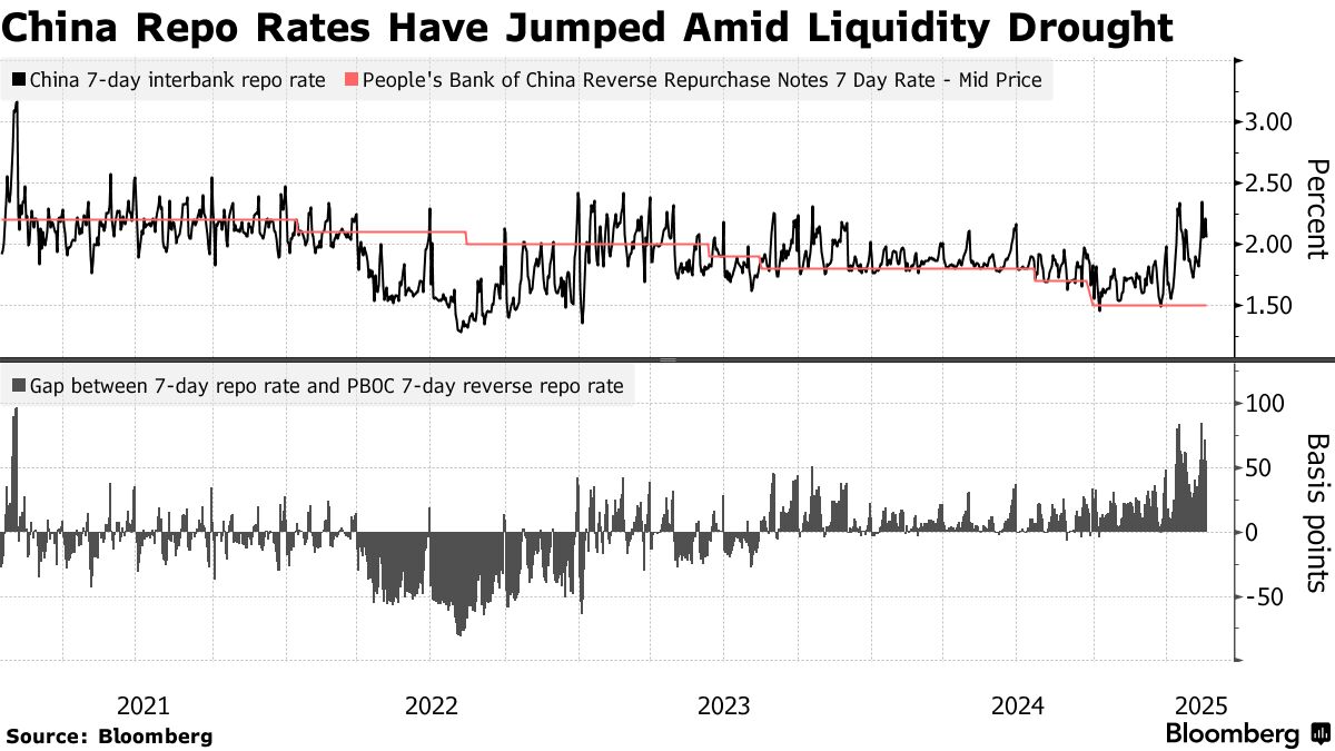中國人民銀行本月多數交易日通過公開市場操作抽離流動性,以製造人民幣稀缺性來支撐匯率。但這帶來了意外後果:銀行選擇囤積現金而非同業拆借,而債券基金因投資者拋售債券套現蒙受損失。週一中國十年期國債收益率創下去年12月以來新高。
