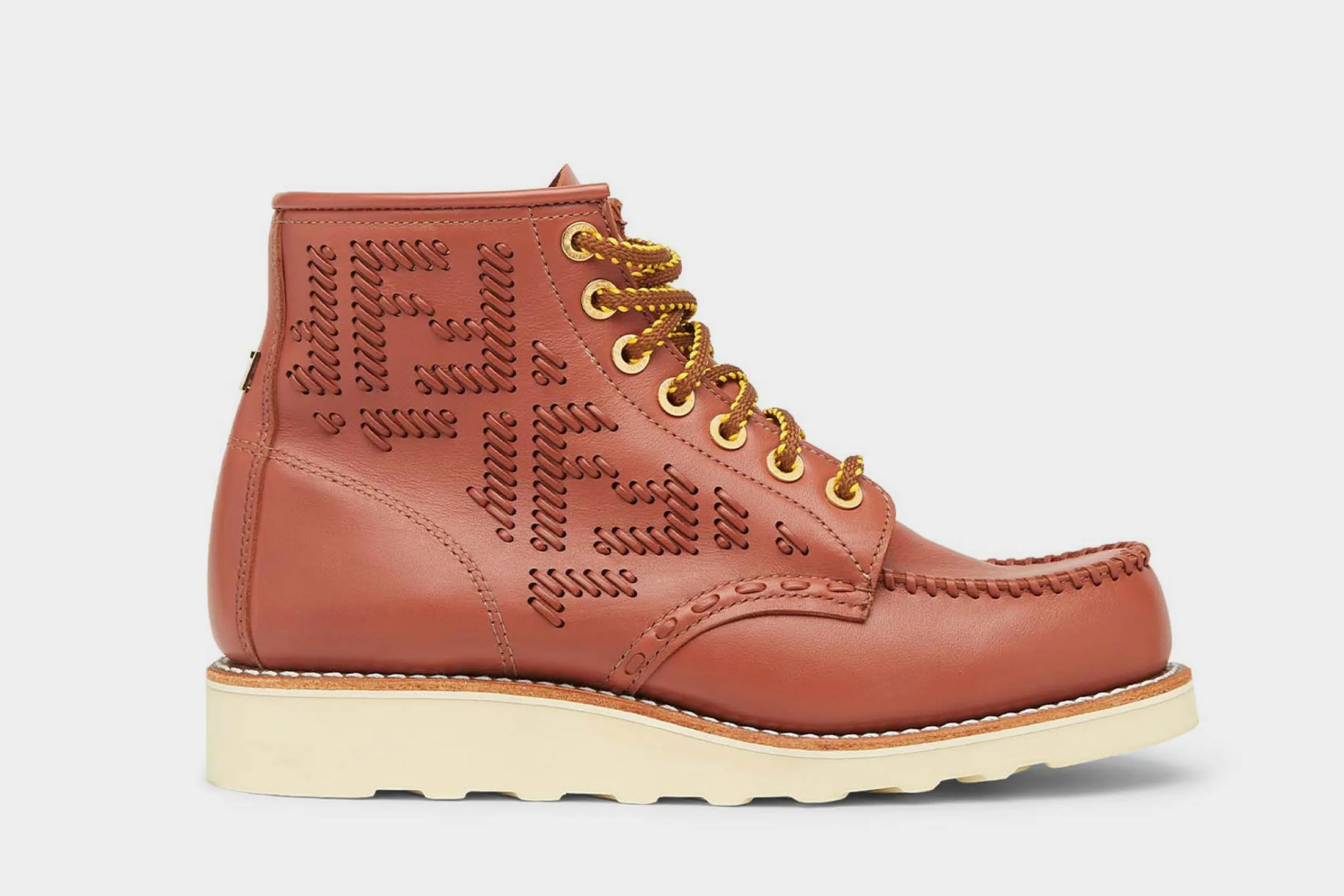 Fendi與Red Wing的聯名款。來源:公司意大利時尚品牌Fendi和明尼蘇達州的Red Wing鞋業公司今年都迎來了里程碑,分別成立100週年和120週年。為慶祝這一時刻,他們合作推出了一款售價1,450美元的Red Wing經典莫卡辛女靴重塑版。有錫耶納紅或自然米色可選,靴子的托斯卡納Cuoio Romano皮革鞋面上手工縫製了Fendi的交織“FF”標誌。鞋底則在美國採用固特異工藝製作。