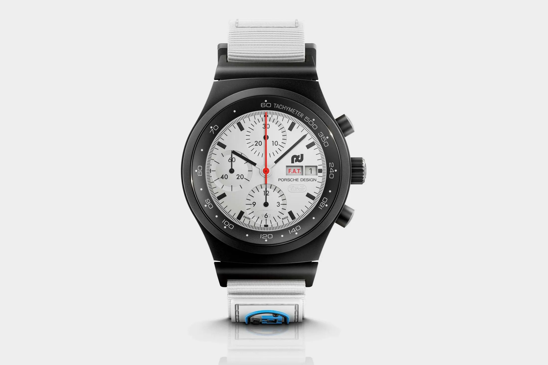 保時捷Chronograph 1腕錶。來源:品牌官方二月,F.A.T.冰雪賽席捲奧地利採爾湖,改裝保時捷與奧迪在雪道上漂移,有時還牽引着滑雪者。“F.A.T.“源自上世紀八九十年代贊助歐洲賽事的已停業物流公司Francais Allemande Transite。保時捷AG創始人曾孫Ferdi Porsche於2019年重啓冰雪賽並復興該名稱。為致敬傳統,保時捷設計推出11,500美元限量版Chronograph 1,配備純白夜光錶盤,可選鈦金屬錶鏈或超長錶帶,可外搭於夾克之上。