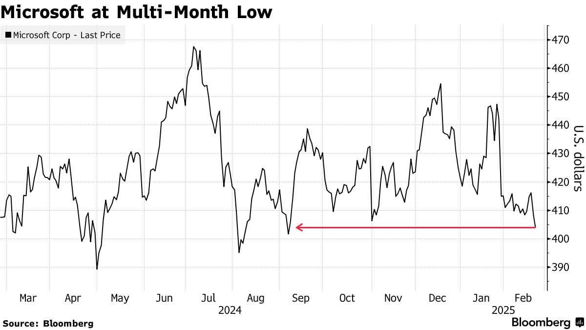 微軟公司週一收盤價創去年9月以來新低,這是這家軟件巨頭近月來處境艱難的最新跡象。該股週一跌1%,此前TD Cowen報道稱公司已取消部分美國數據中心容量租約,引發市場對其長期AI算力儲備是否過剩的擔憂。當前股價較去年7月峯值下跌近14%。