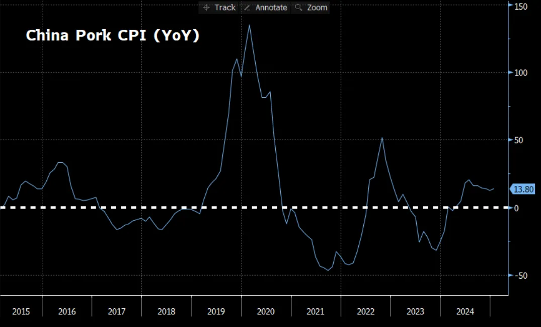 據美國農業部報告顯示,非洲豬瘟疫情導致數百萬頭生豬死亡或被撲殺,中國豬肉產量預計減少2790萬噸。供應萎縮引發豬肉價格飆升,而豬肉恰好是中國CPI的重要組成部分。