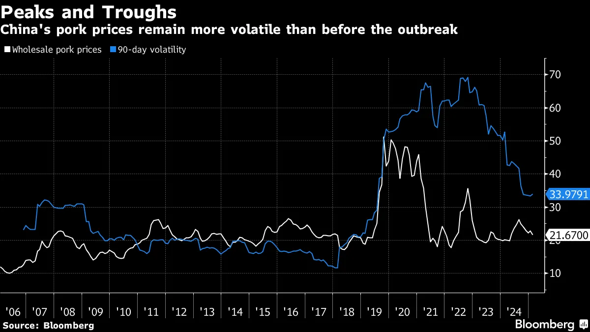 首先,上圖顯示2018年爆發的非洲豬瘟導致豬肉價格波動加劇,其影響延續至今。一項針對豬價波動的2024年研究指出,中國的"豬週期"在2018年後顯著強化。該研究將豬瘟列為"豬價波動的首要因素……不僅直接導致生豬供應鋭減,還通過影響市場預期和消費行為進一步加劇了價格波動"。