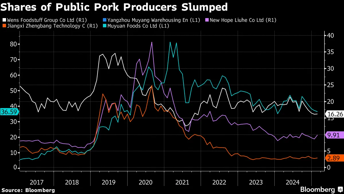此外,大型豬肉生產企業還能通過資本市場融資重建產能(政府也鼓勵銀行擴大對該行業貸款)。隨着中國當局推動增產,資金大量湧入,上市豬企股價飆升。
