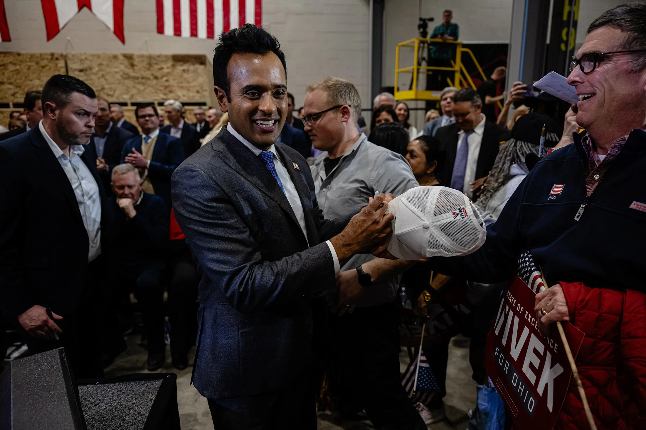 拉馬斯瓦米週一在辛辛那提附近舉行競選宣佈活動時的支持者。攝影師:喬恩·切裏/蓋蒂圖片社拉馬斯瓦米的總統競選活動嚴重依賴新媒體,由後來被認為吸引年輕選民支持特朗普的同一批多才多藝的播客主推動。他早在特朗普之前就與洛根·保羅和Nelk Boys一起亮相。拉馬斯瓦米還與許多最終轉向特朗普的科技和金融億萬富翁關係密切。這包括馬斯克,他在支持最終成為總統的特朗普之前,曾為拉馬斯瓦米渺茫的前景造勢。