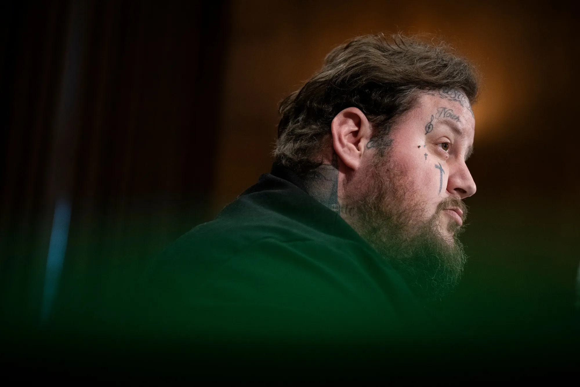 2024年1月11日週四,美國華盛頓特區參議院銀行、住房和城市事務委員會聽證會上的音樂人傑森·“果凍卷”·德福特