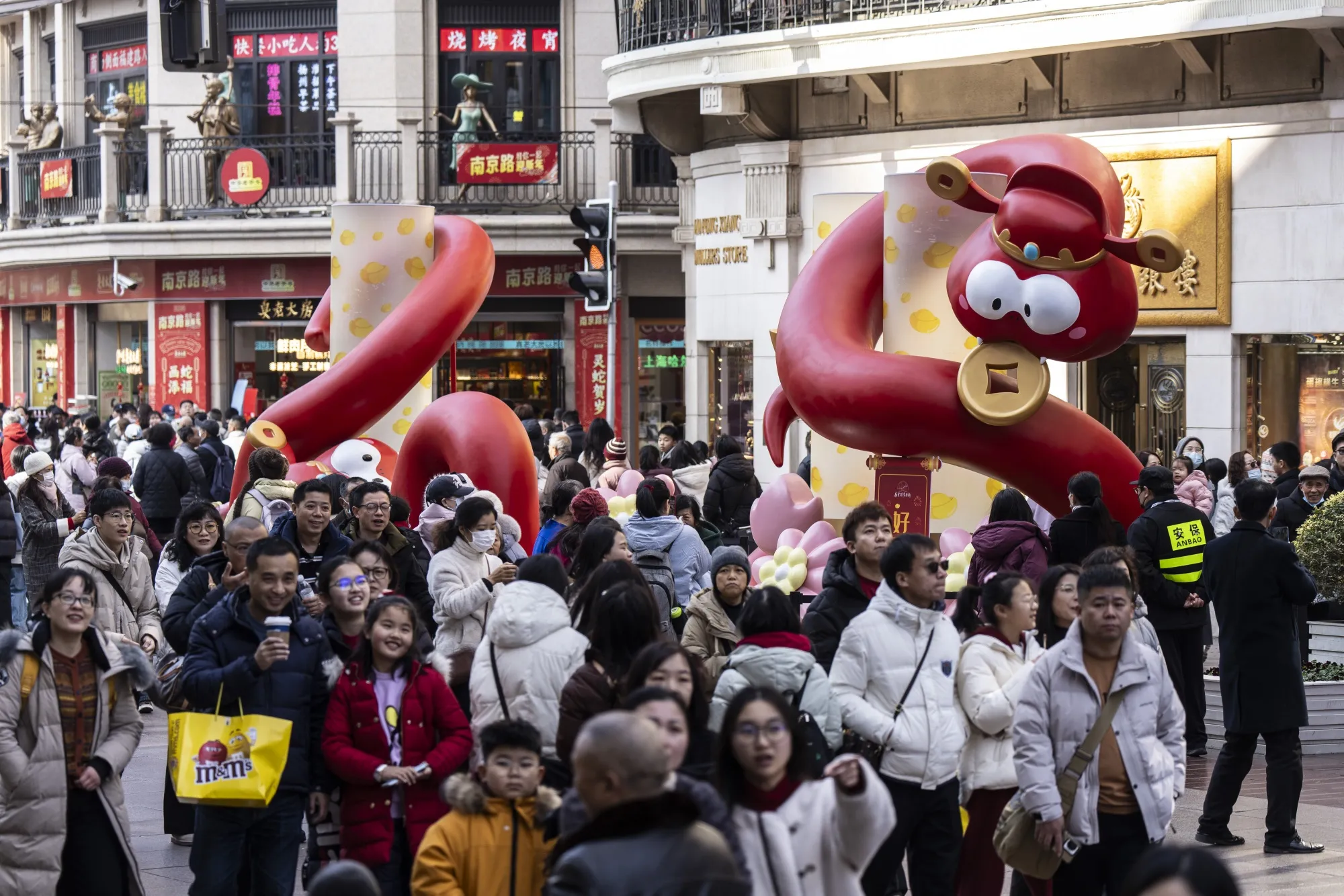 上月農曆新年假期期間,購物者穿行於上海南京東路商業區。