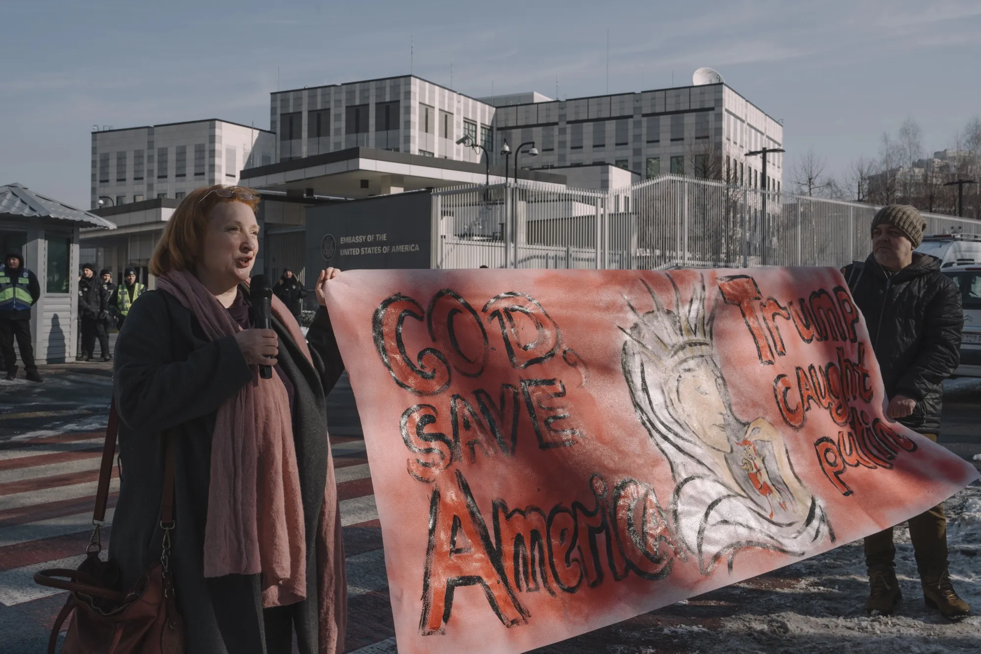 2月26日,烏克蘭民眾在美國駐基輔大使館外舉橫幅抗議資源協議。攝影師:安德魯·克拉夫琴科/彭博社歐洲官員從澤連斯基訪美簽署協議中獲得些許鼓舞——該協議將給予美國未來烏克蘭礦產等資源收益的較大份額,作為對其支持的補償。