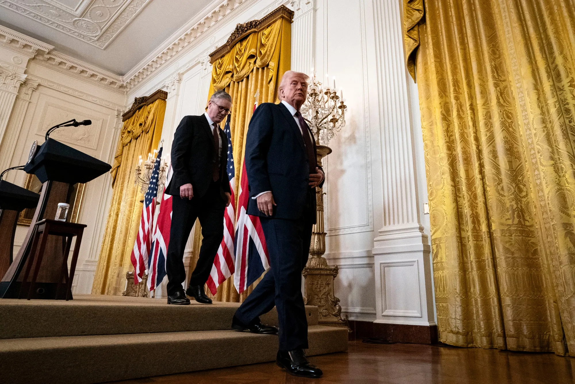 2月27日新聞發佈會結束後,基爾·斯塔默與唐納德·特朗普離場。攝影師:阿爾·德拉戈/彭博社然而更禮貌的言辭無法抵消特朗普的拒絕表態——當斯塔默代表基輔及其歐洲盟友提出訴求時,他拒絕承諾美國將為其擬派往烏克蘭的部隊提供支持,以確保俄羅斯遵守任何和平協議。