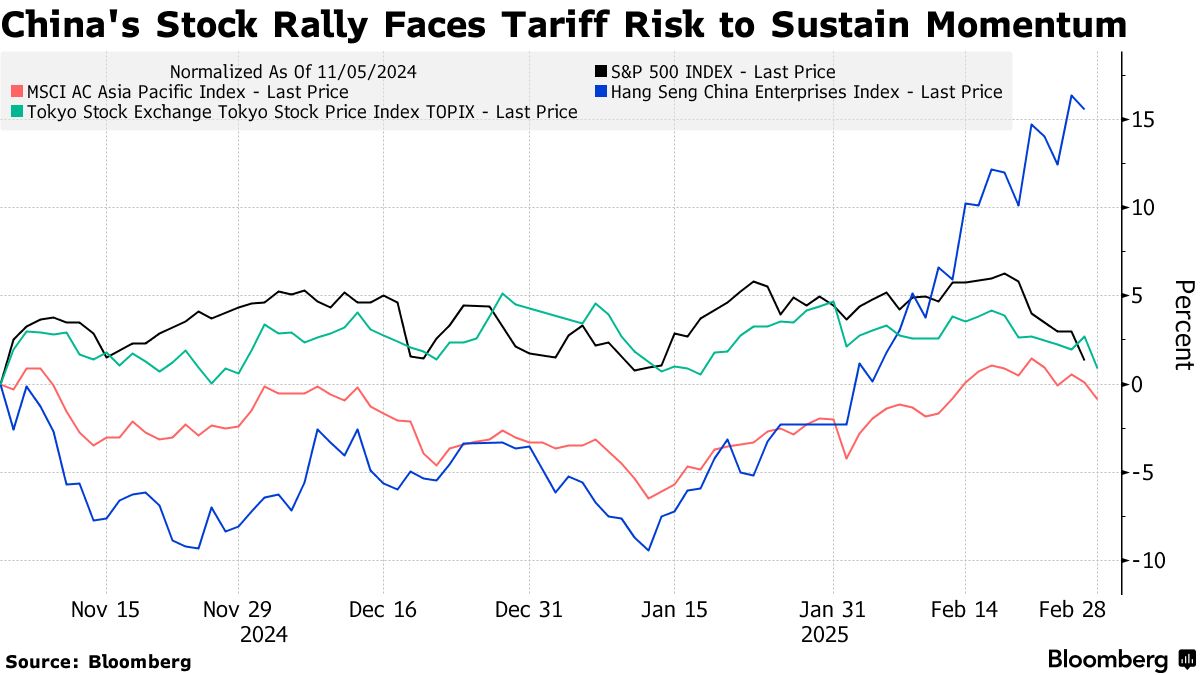 “這額外的10%令人沮喪,因為它持續帶來不確定性。對中國股票而言,這主要是情緒驅動——全球投資者在反應,而非境內投資者。iShares中國大盤股ETF(FXI)在紐約收盤時的拋售顯示離岸頭寸仍然疲軟,而隨着下週中國’兩會’召開,刺激政策的討論可能改變市場情緒。”