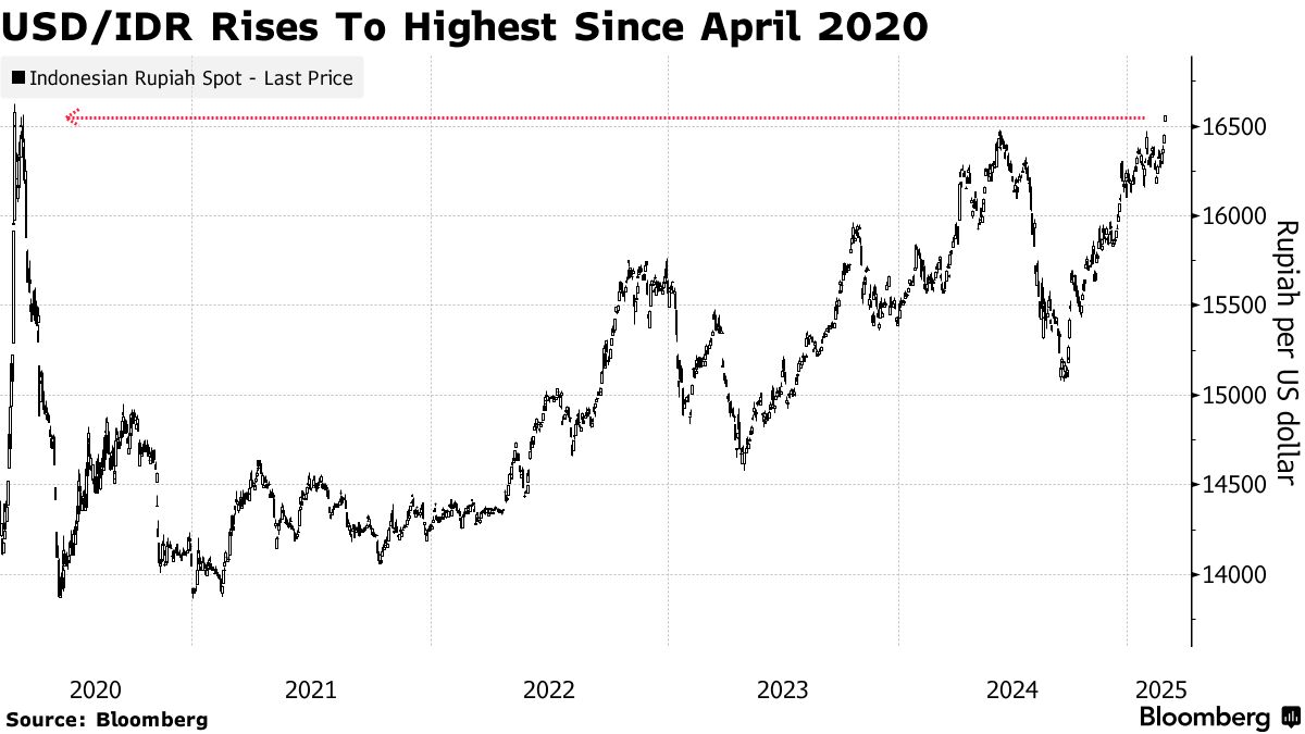 週五印尼盾下跌0.7%至16,578,為2020年4月以來最弱水平,因美國對加拿大和墨西哥的關税將於下週生效。雅加達綜合指數下跌3%,較9月曆史高點跌幅已超20%。