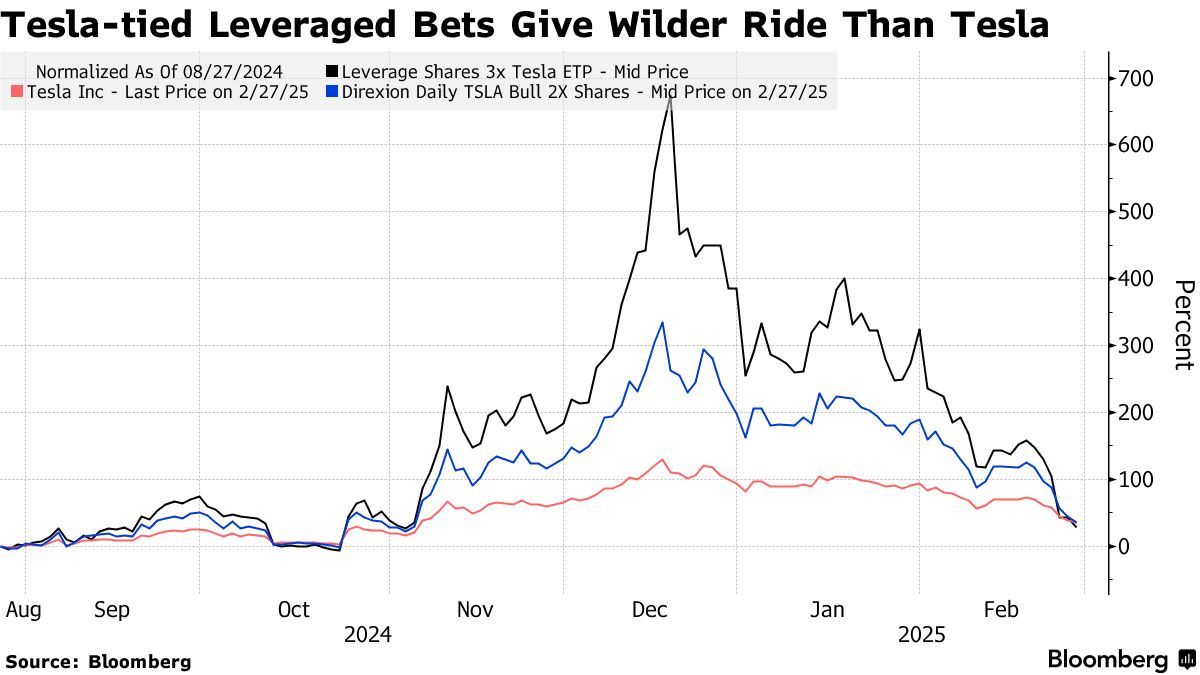 槓桿交易所交易產品(ETPs)在全球範圍內廣受歡迎,在美國大選後的牛市熱潮中,華爾街的產品經理們大量推出此類產品。然而,隨着"美股七巨頭"因特朗普總統關税政策帶來的不確定性及中國科技競爭對手崛起而暴跌,那些依賴美國超級大盤股不可阻擋漲勢的投機性產品正面臨壓力。